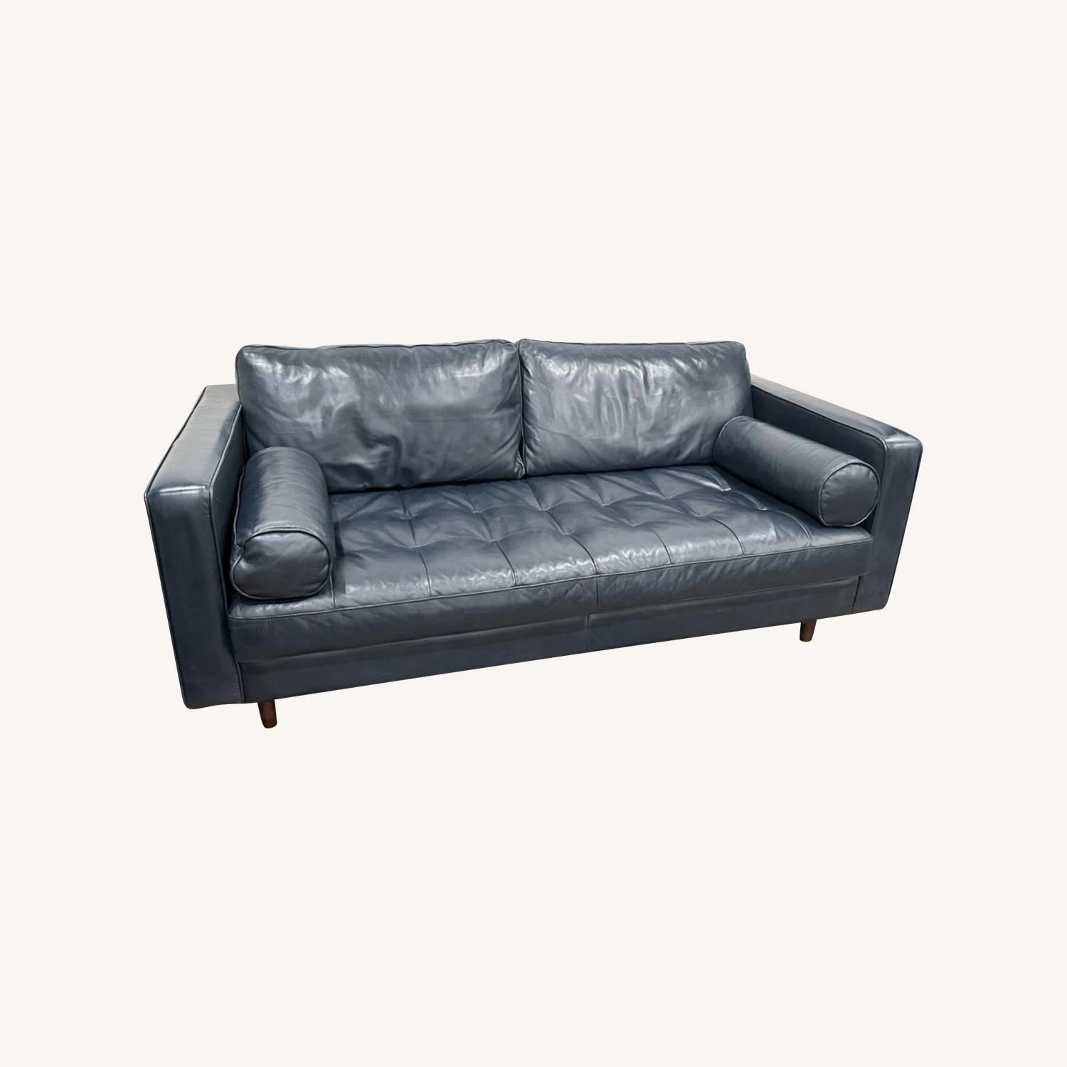 upholstered in semi-aniline leather, this blue leather sofa boasts a tufted bench seat that begs to be napped on. Add in the overstuffed cushions and two loose bolsters, and you’re looking at a sofa that hosts as hard as it chills. Over time, the leather will take on a subtle patina. Everything gets better with age. Natural color variations, wrinkles and creases are part of the unique characteristics of this leather. It will develop a relaxed vintage look with regular use.