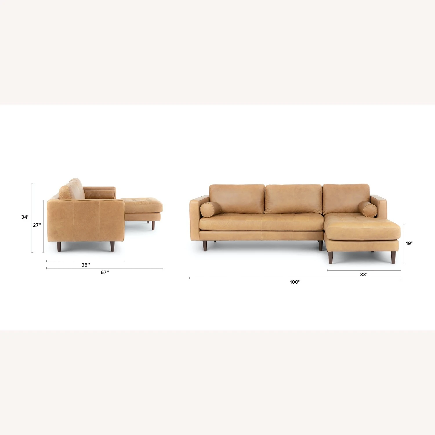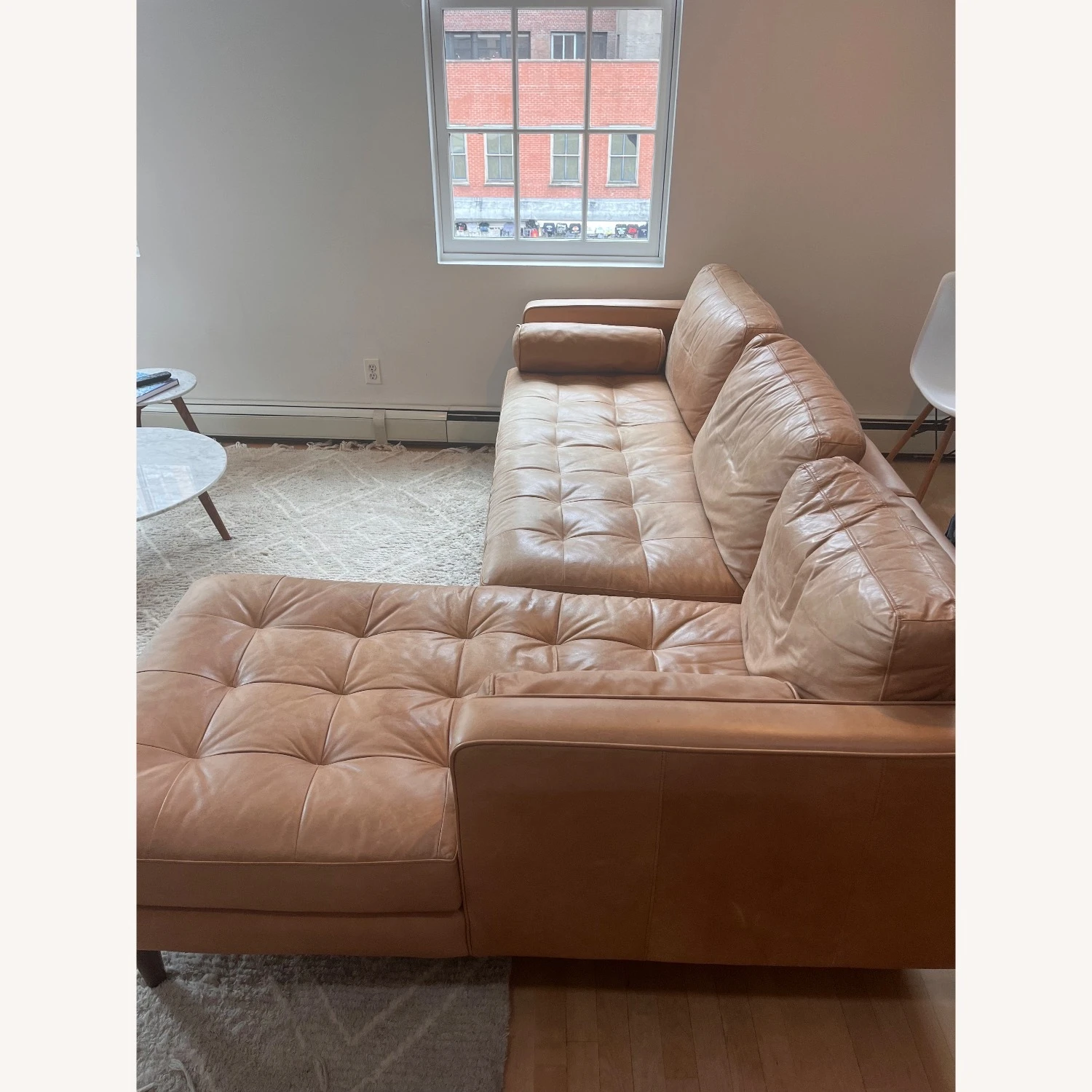 Seller’s Notes: Article Sven Charme Tan Right Sectional Sofa in leather fabric. Incredibly stylish & comfortable. Light stain on right side of the couch, though not easily noticeable.