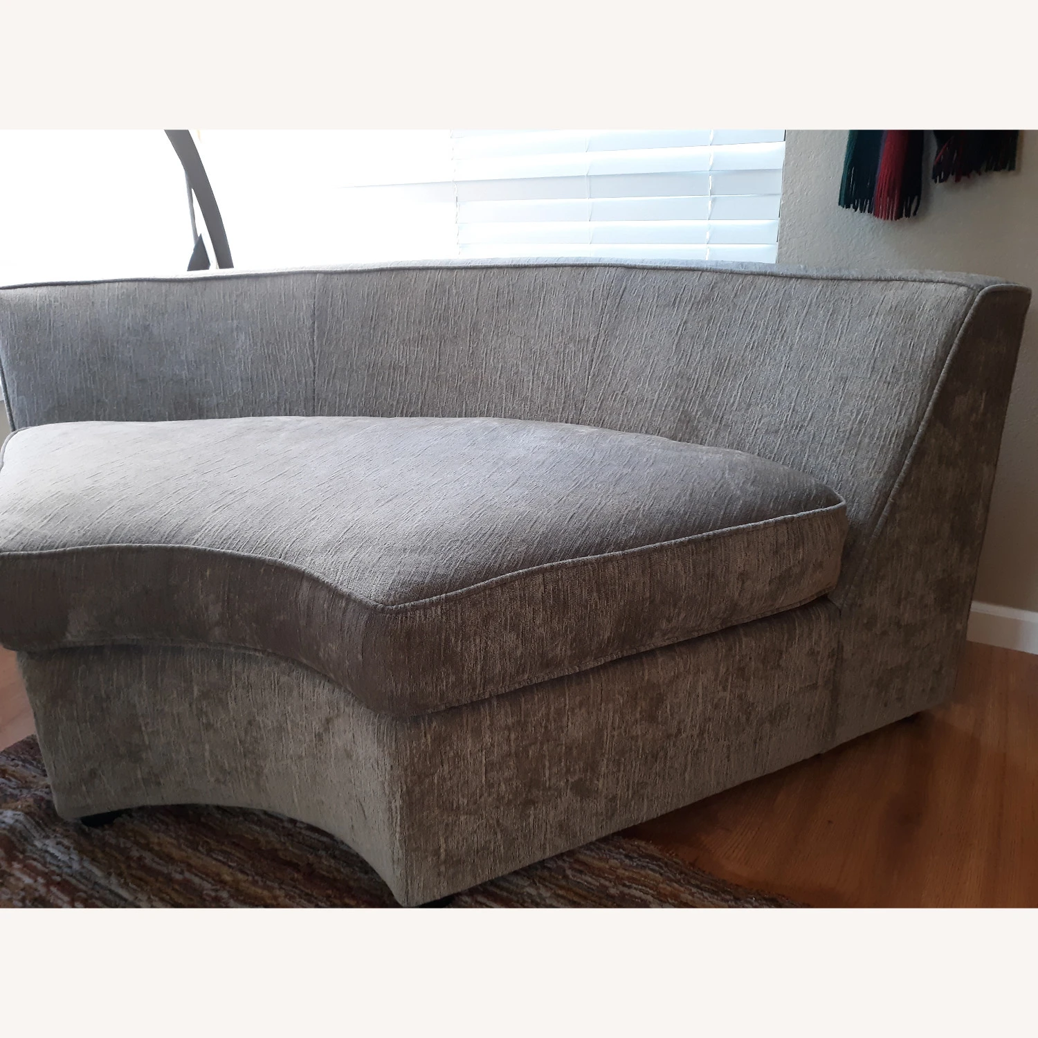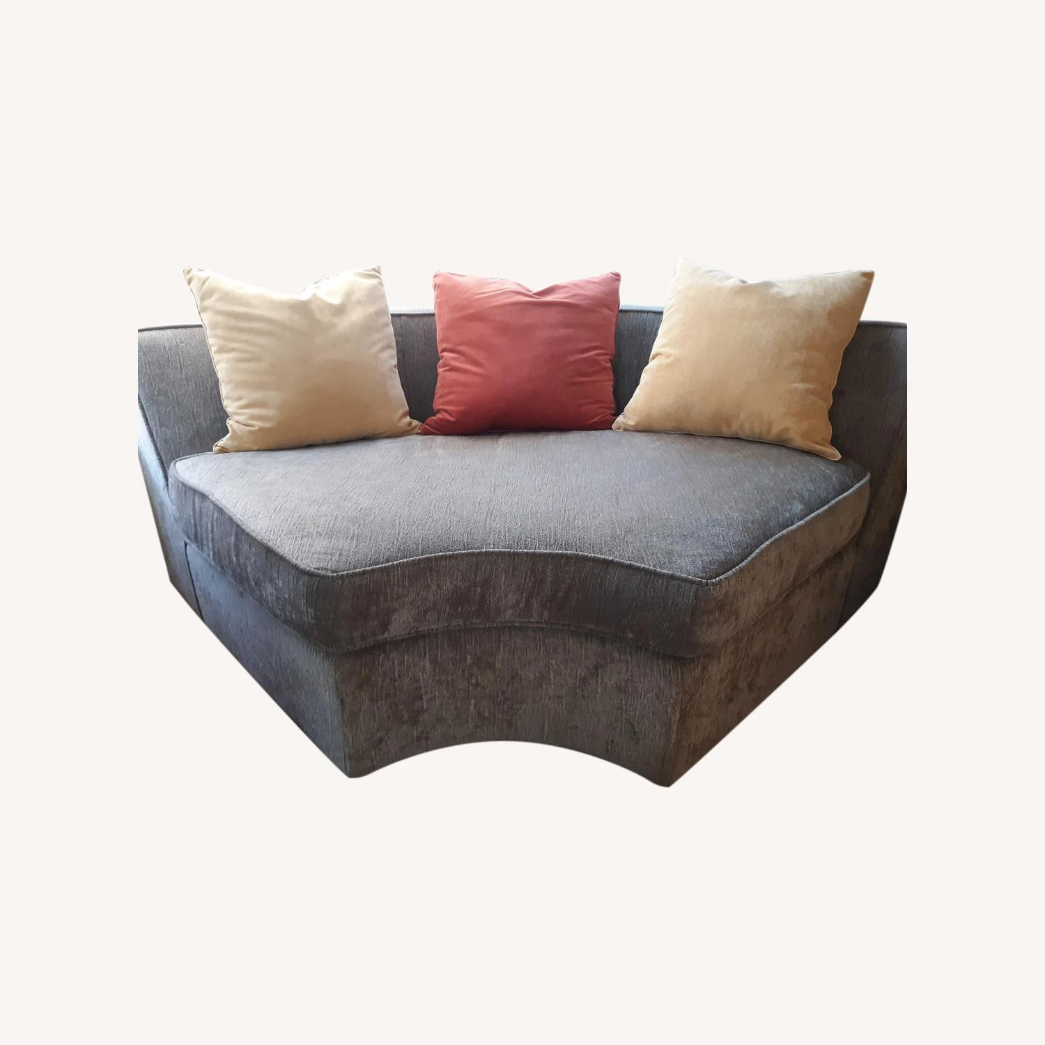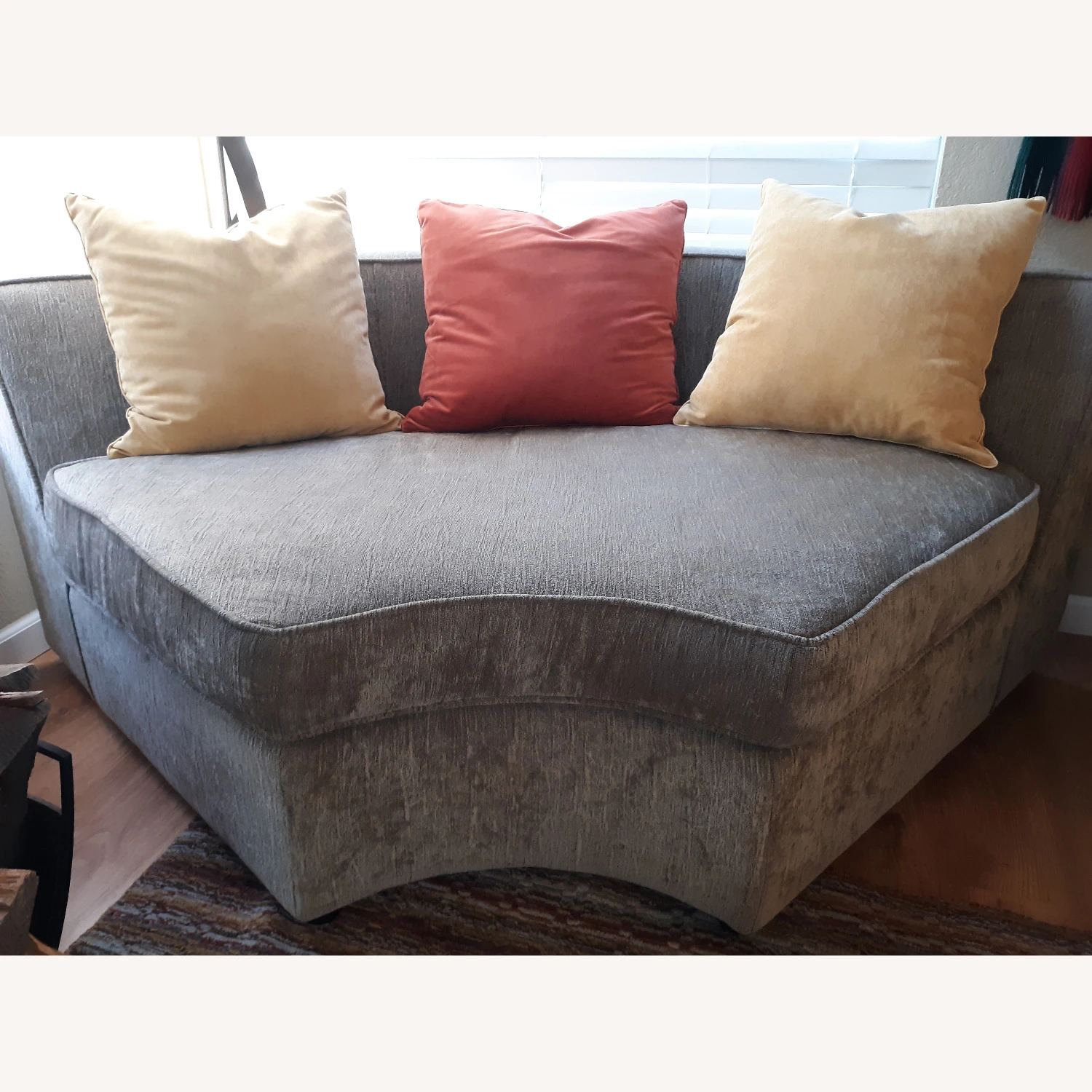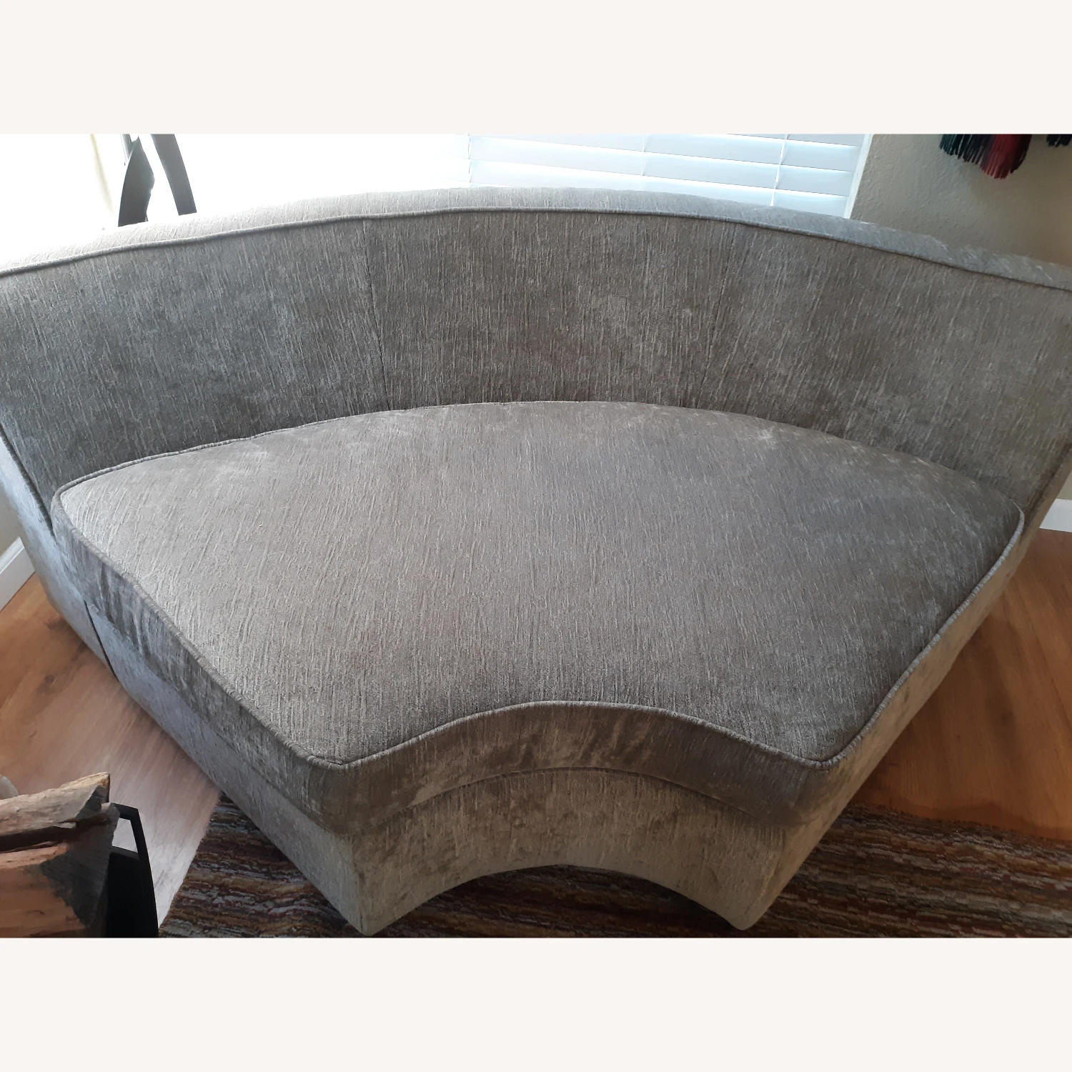 Petite? Think of the shape as a rounded wedge such that placing several side by side might form a circle. I can imagine that if you placed say 4 or 5 identical pieces side by side I could see them forming a circle. That said if I run a tape measurer along the wide, rounded back of the piece (tape literally pressed against fabric for the full length of measure end to end) it looks to me to be about 79 inches. Doing the same at the very front of the piece it measures about 24 inches! So depending on where you place the piece (e.g., corner) its “footprint” in the room might be quite small though it easily accommodates two people if not more.