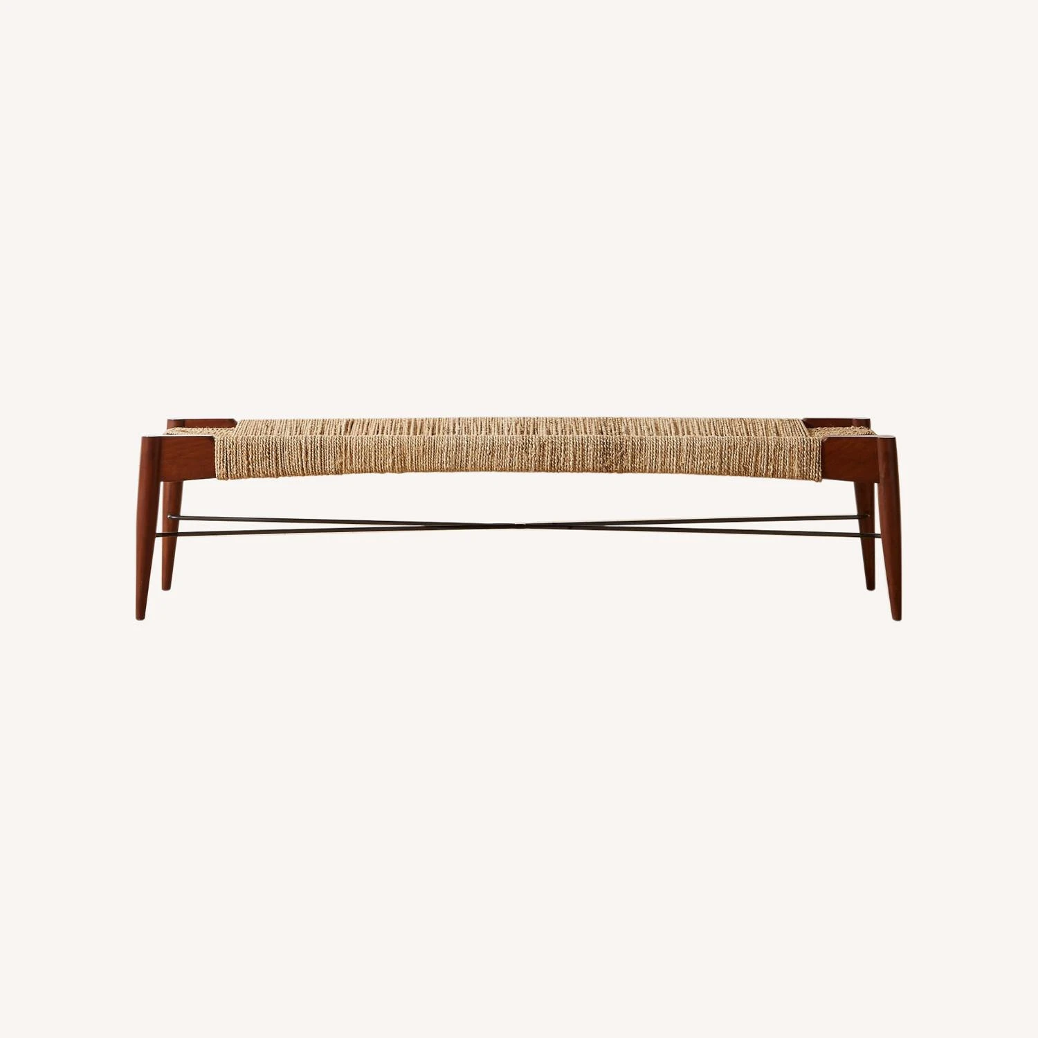 Inspired by traditional Indian cots, jute rope warps/wefts varying tones over an open frame handcrafted of solid sustainable acacia wood. Bench frame flows continuous to base via mortise and tenon joinery on rounded legs that taper to a pencil-fine point. Iron crossbrace gives bench a modern nod.