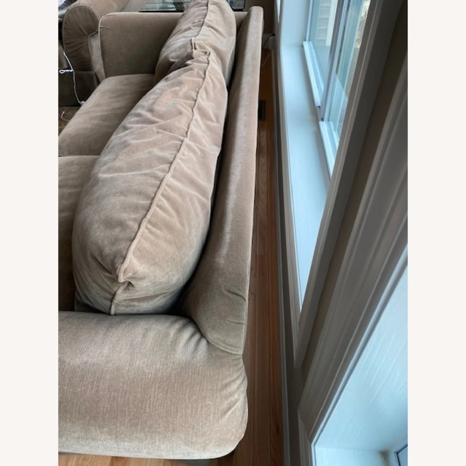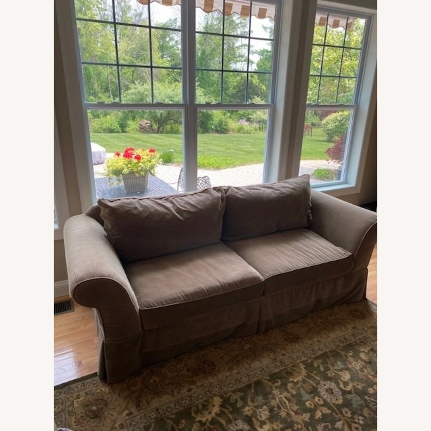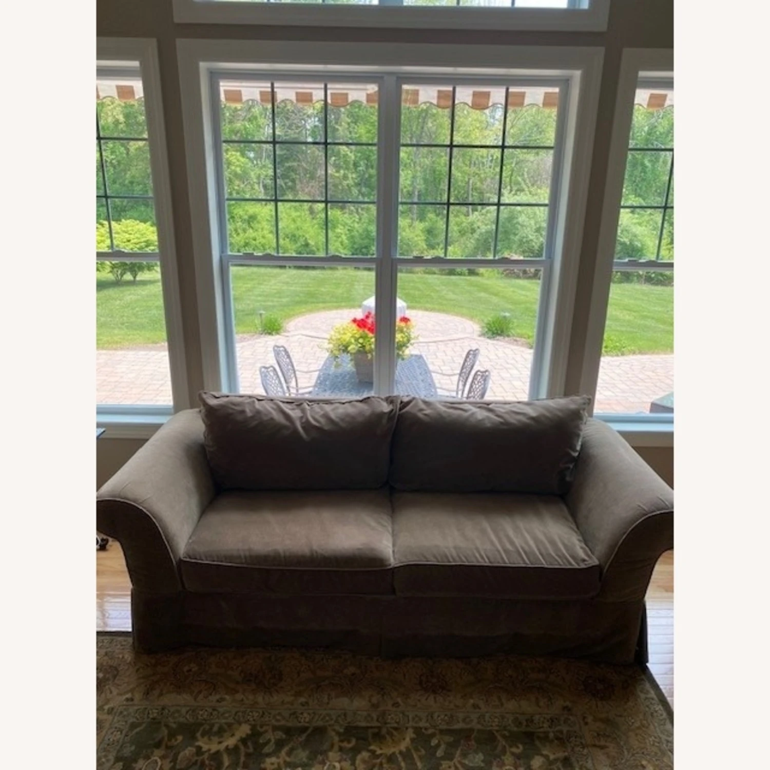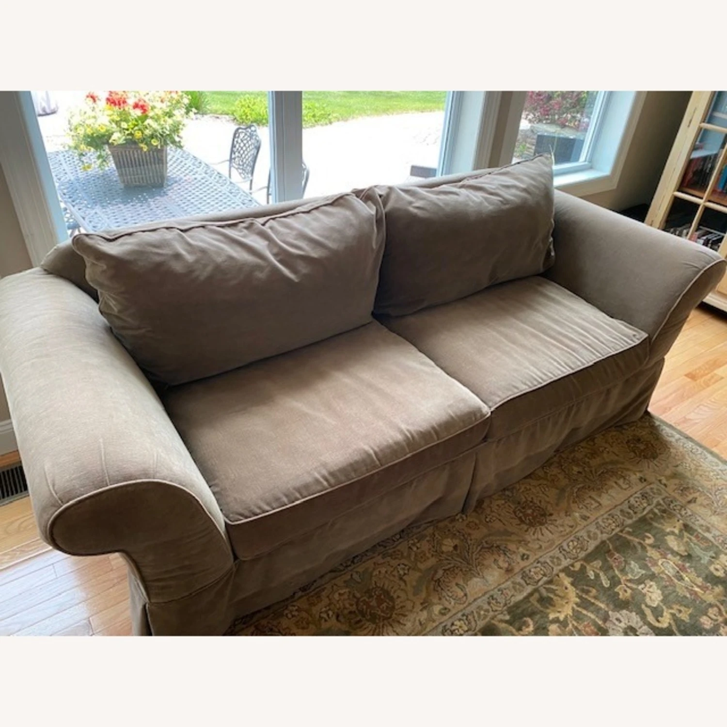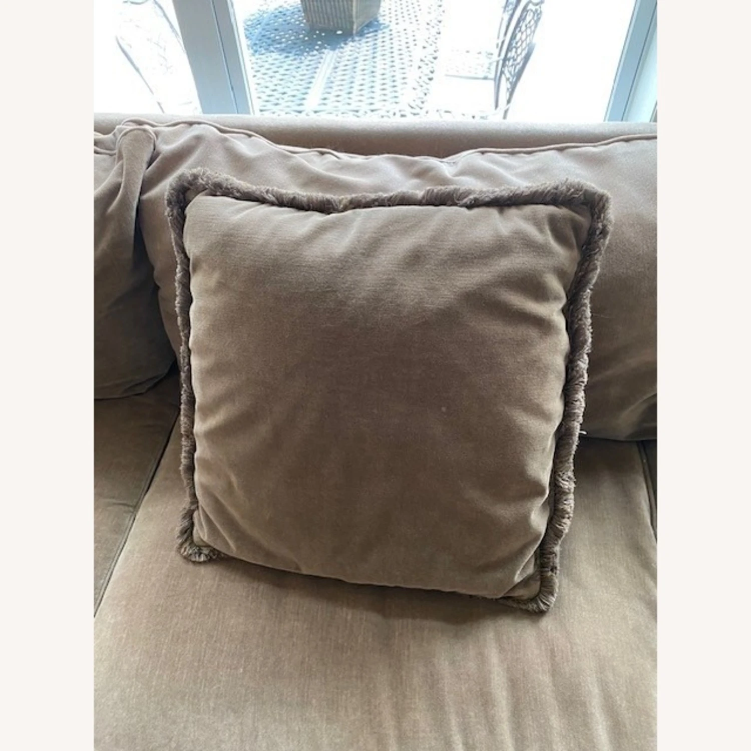 Seller’s Notes: I bought this couch from Domain Furniture about 10 years ago. The velvet like material has been scotch guarded and is in overall good condition. Warm, sage green tone covers this comfortable sofa. Further enhancing the sophisticated appeal are the kick-pleat skirt and down blend back pillows and seat cushions. Sofa also includes 2 toss pillows. All covers can be removed and washed if needed. Matching glass coffee and end table available in different listing, if interested.