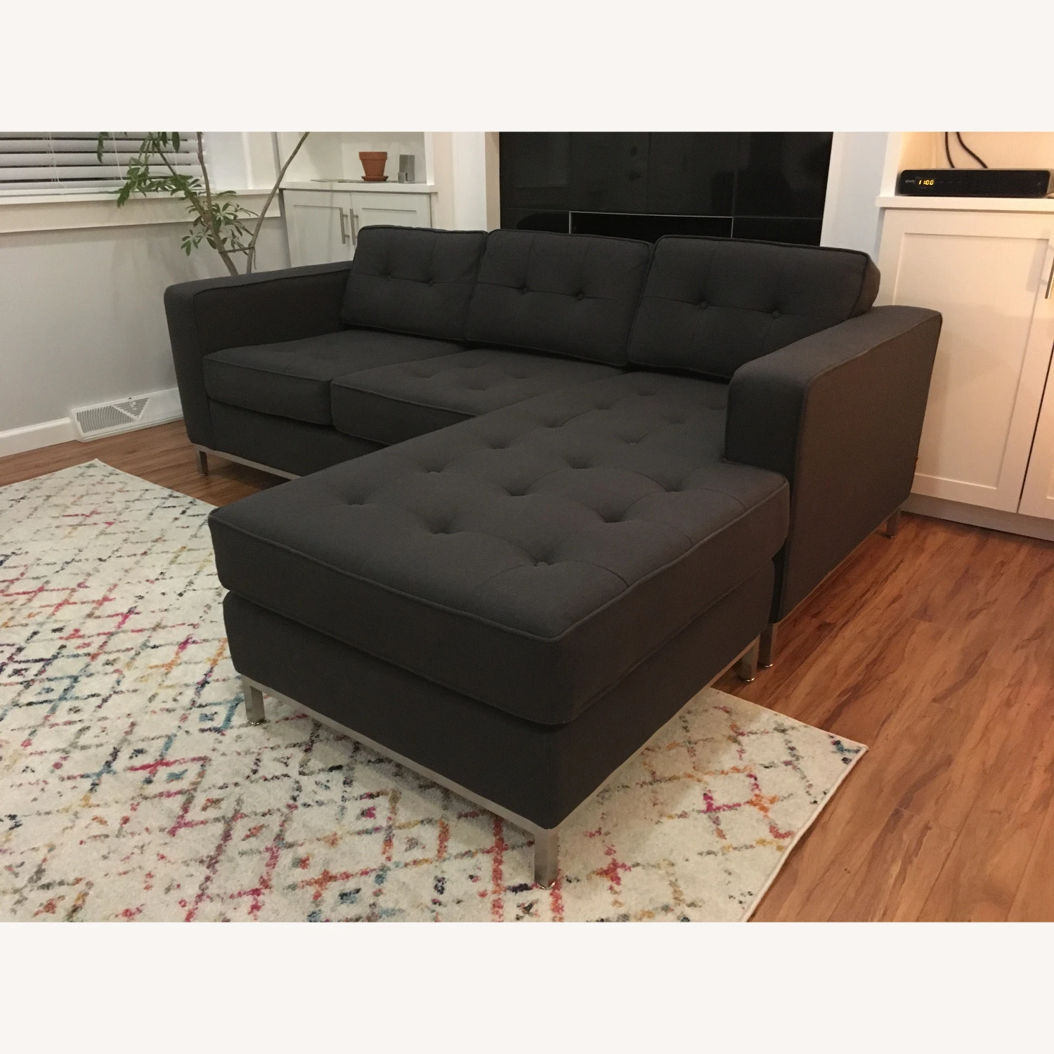 The Jane LOFT Bi-Sectional is well suited to city living. It has been cleverly designed so that it can be configured with the chaise on the right OR left, depending on your floor-plan. If your needs change, simply move the chaise and re-adjust the cushions to convert the design. It features button-tufted cushions and a stainless steel perimeter base. The color is called Urban Ink Tweed. Stainless steel frame with adjustable feet. Constructed with 100% FSC®-Certified Wood in support of responsible forest management.