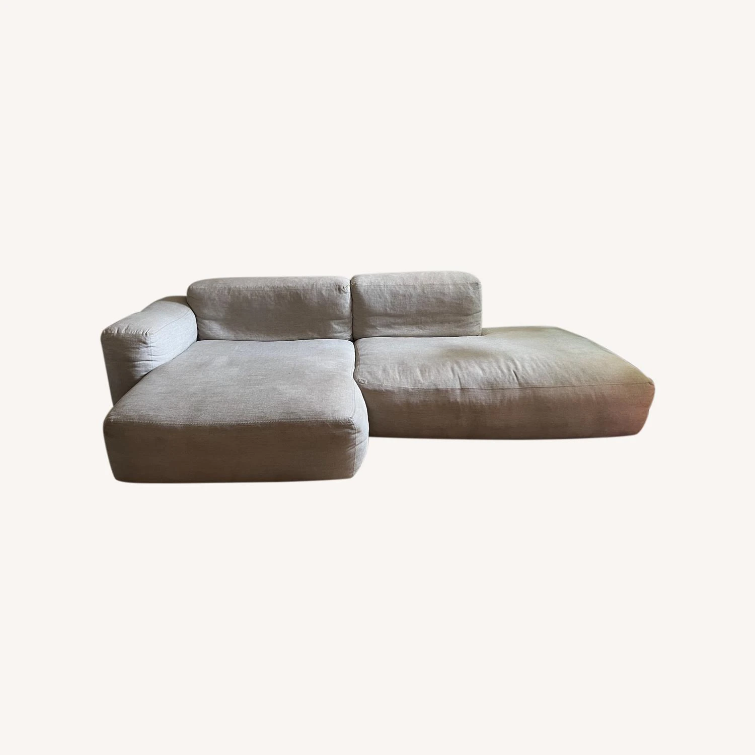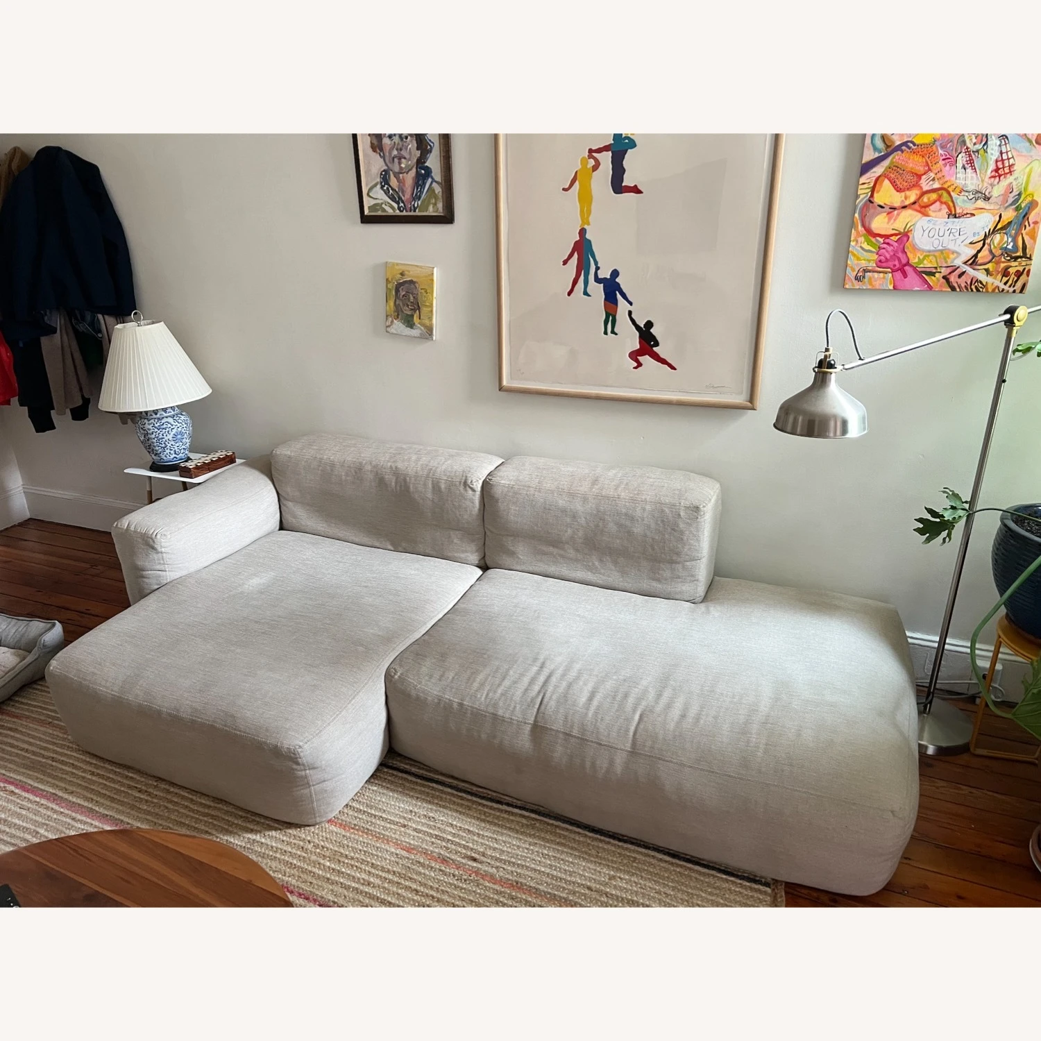 This sofa is about 4 years old and in great condition. We especially loved the chaise, the low seat, and the modern, sleek look. There are no tears or scratches, some slight discoloration from normal use, no major stains. From a smoke free home, has been exposed to a non-shedding dog.