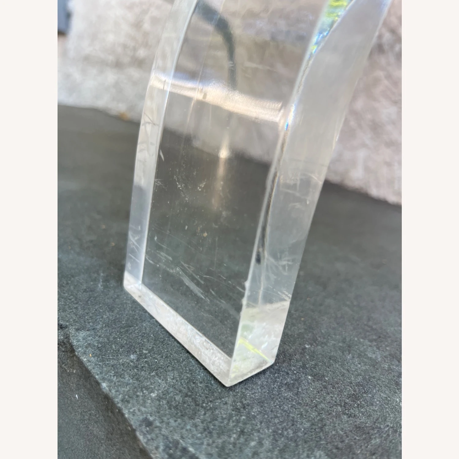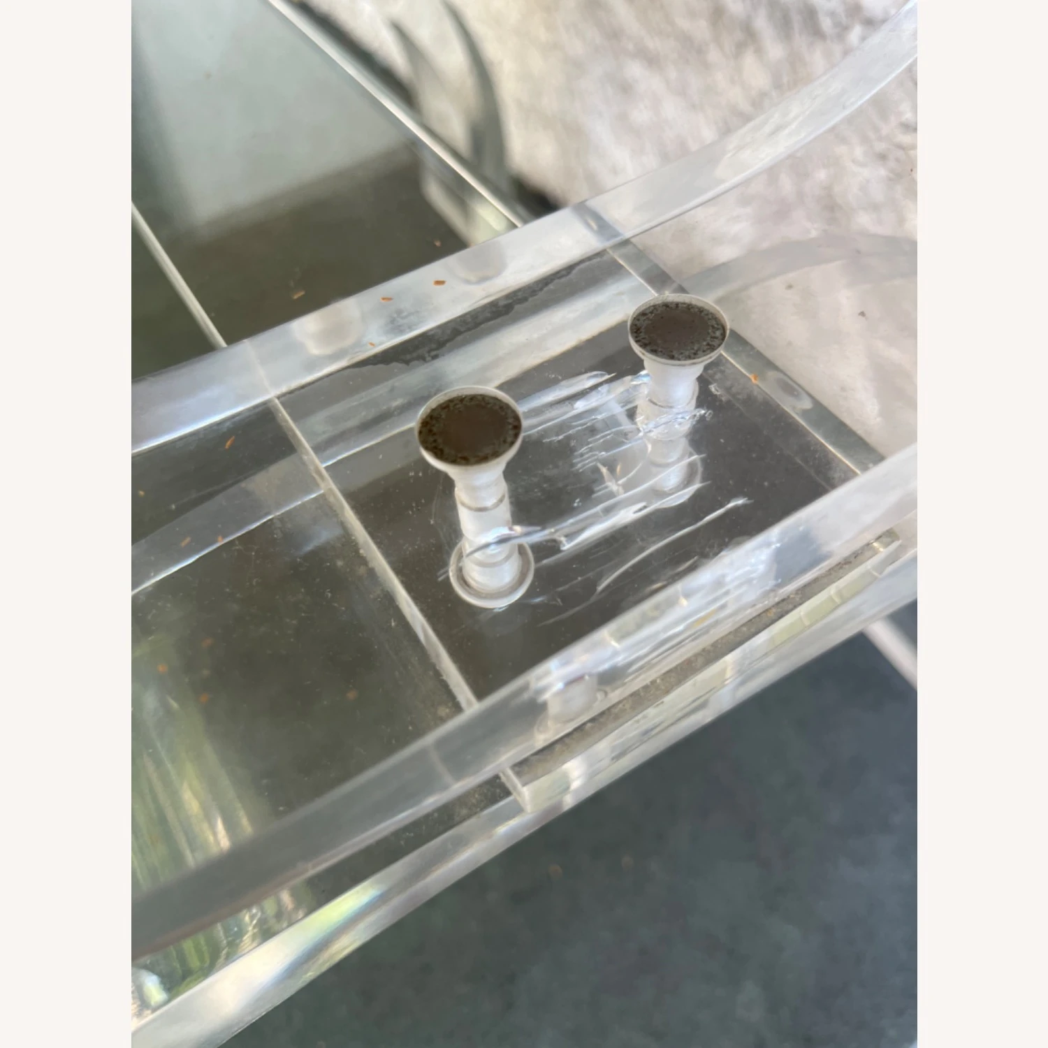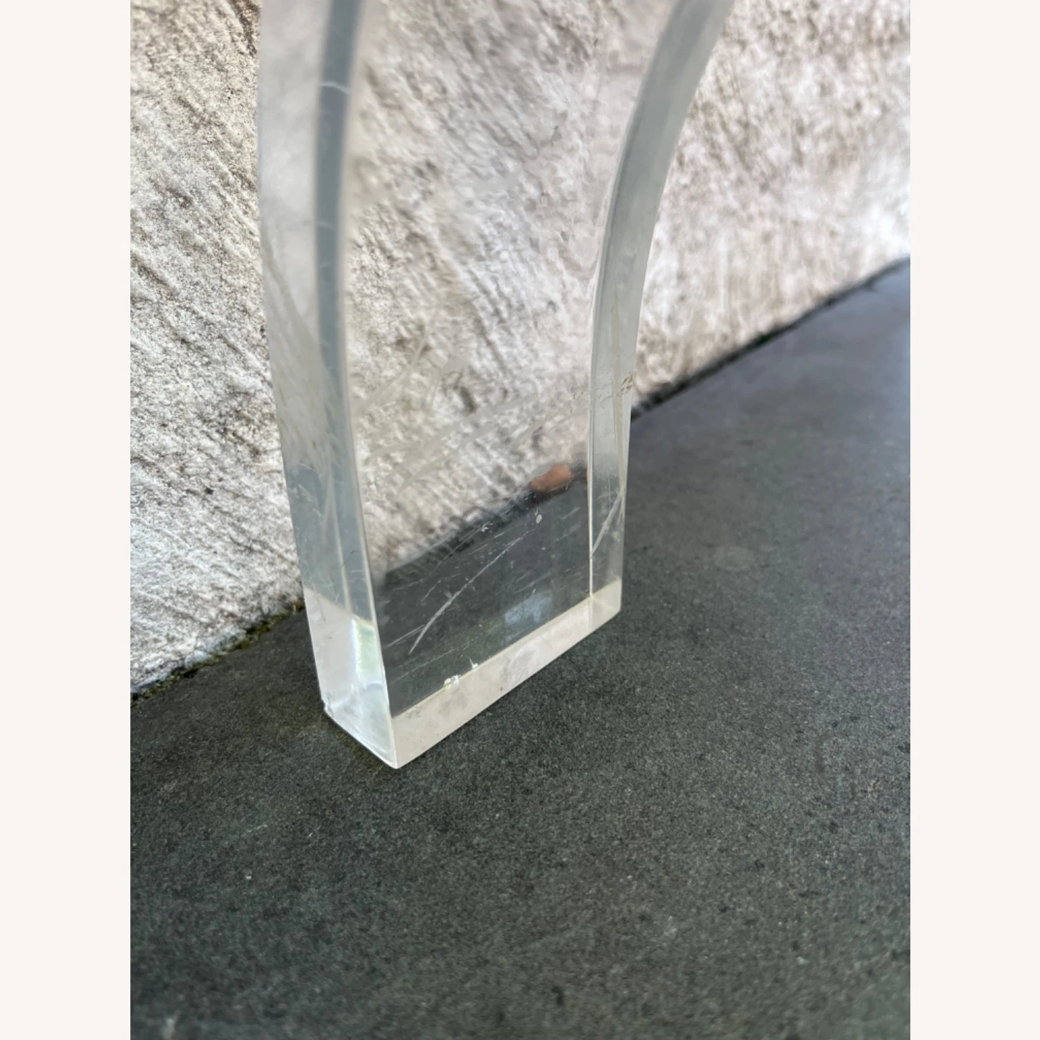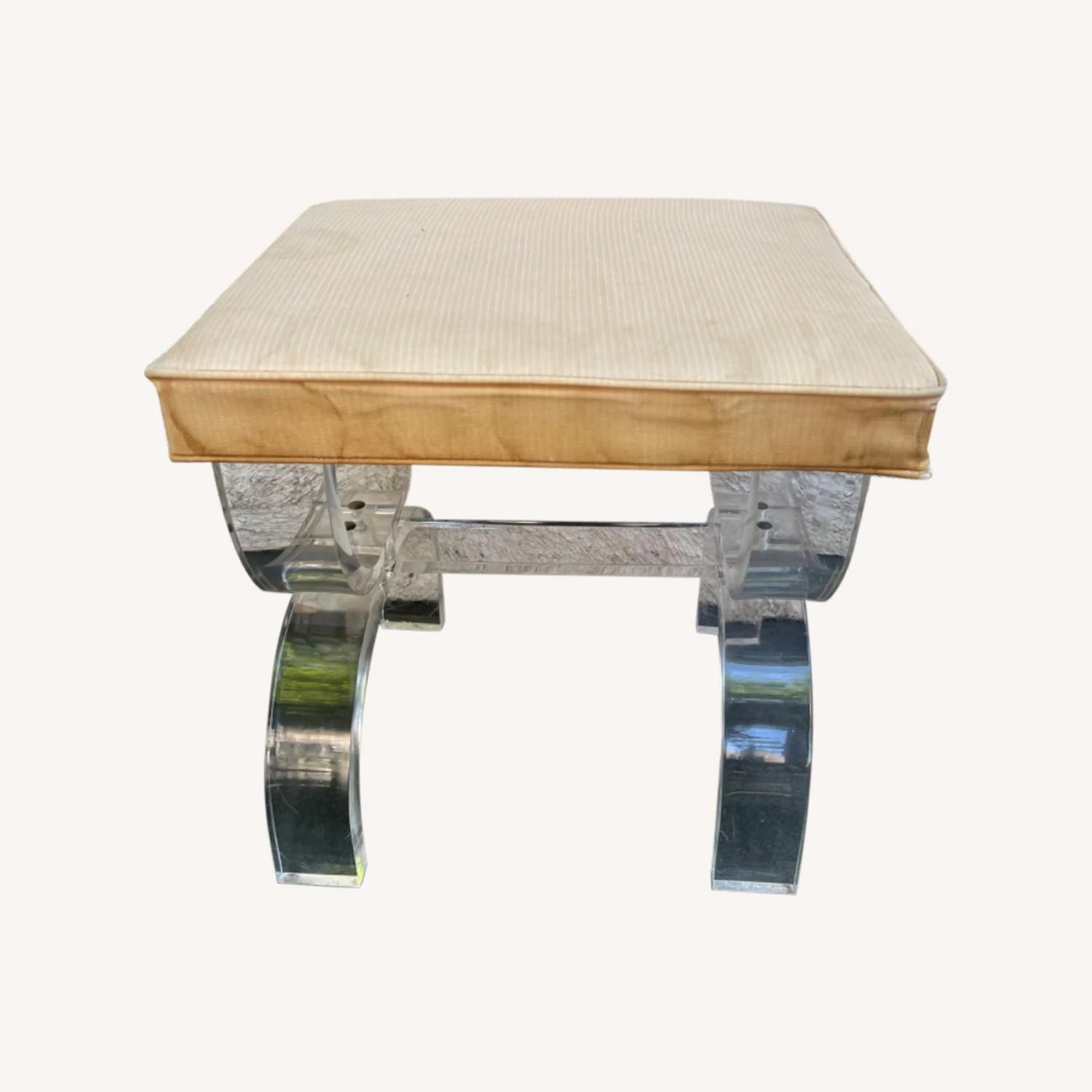 Seller’s Notes: X frame lucite base in the style of Charles Hollis Jones. Manufactured by Hills. The bench measures 17” high by 17” wide by 14 1/2” deep. Upholstery is stained and there are some scuffs and crazing to the lucite.