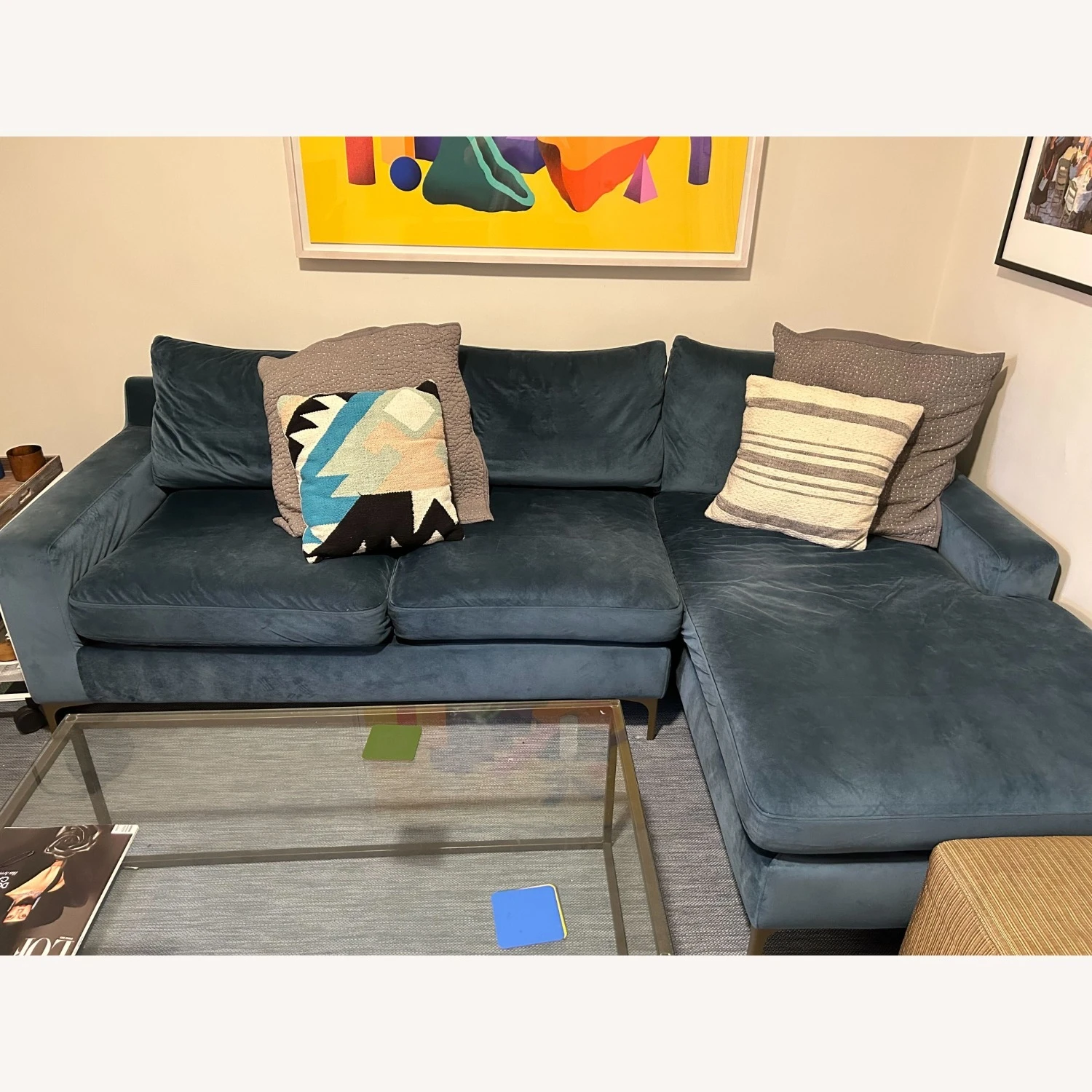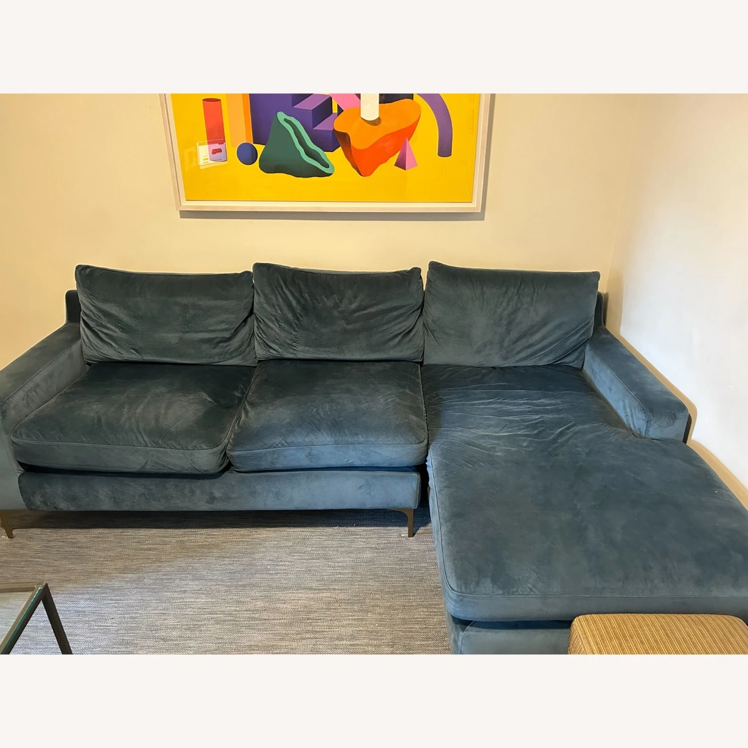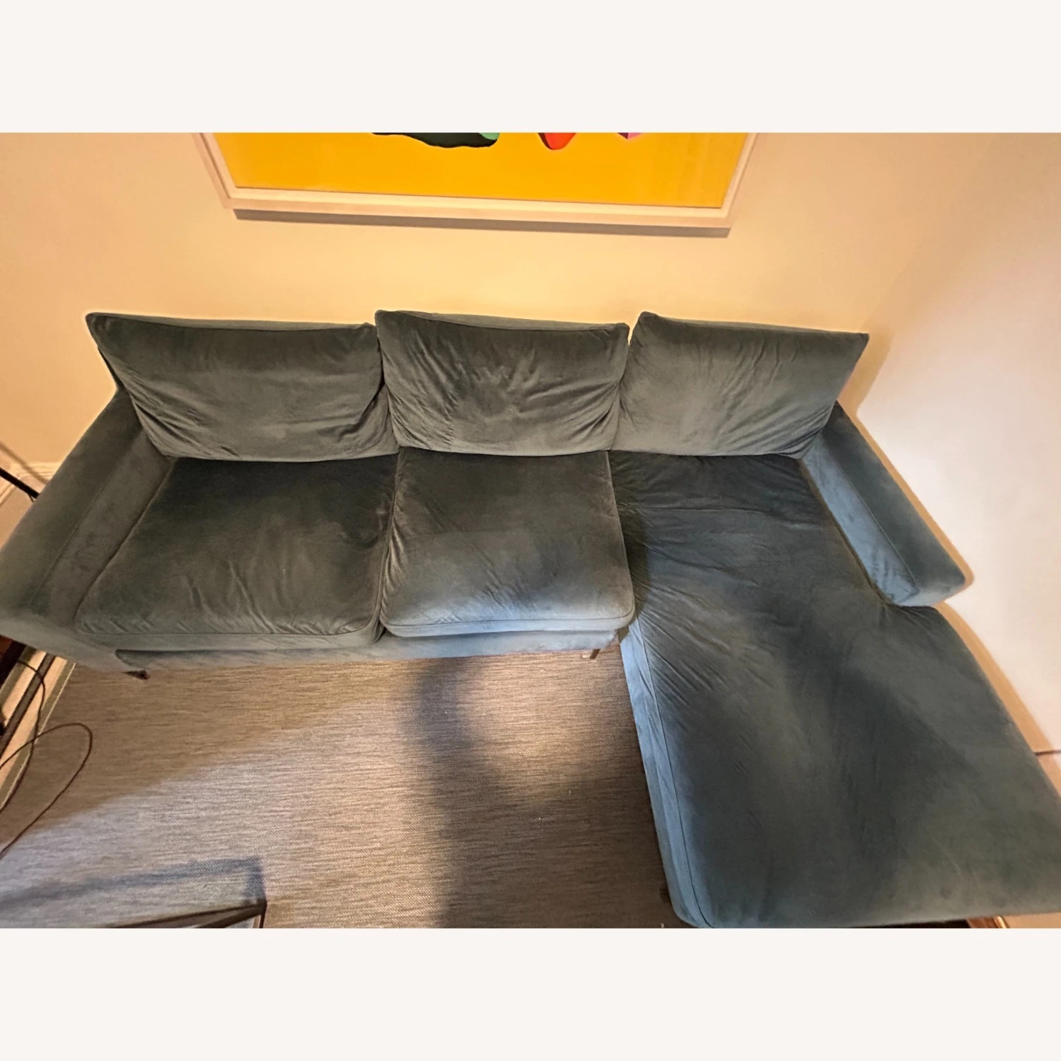 Seller’s Notes: I bought this beautiful custom made couch 2 years ago and now moving but it sadly won’t work in the new space. 3 seat right chaise. 100″ length x 36″ deep (chaise 63″ length). Blue velvet with brass plated legs. Super comfortable, double down filled. The velvet is loosened in some spots but smooths out once vacuumed.