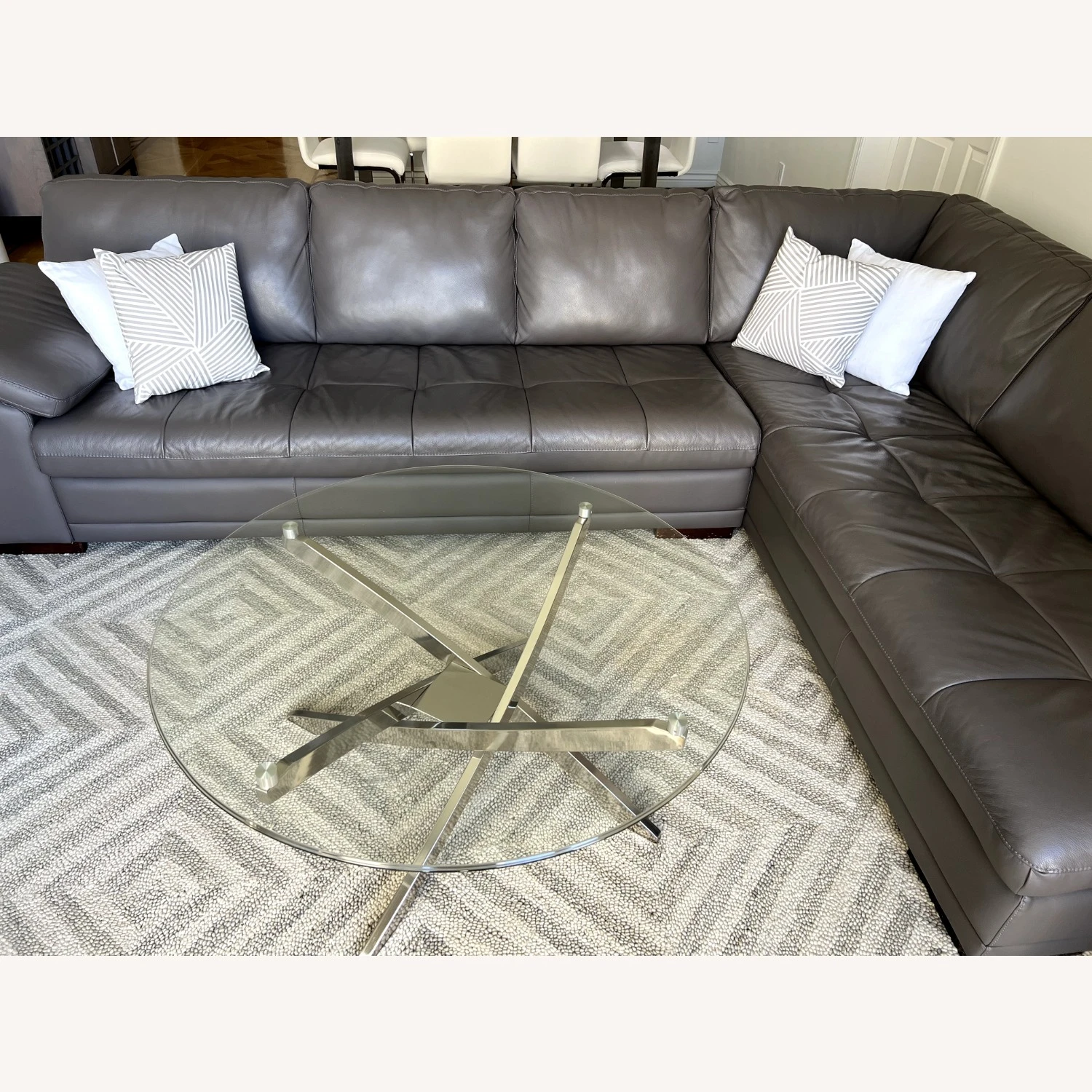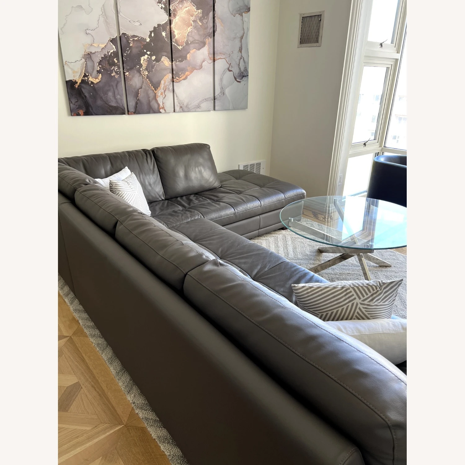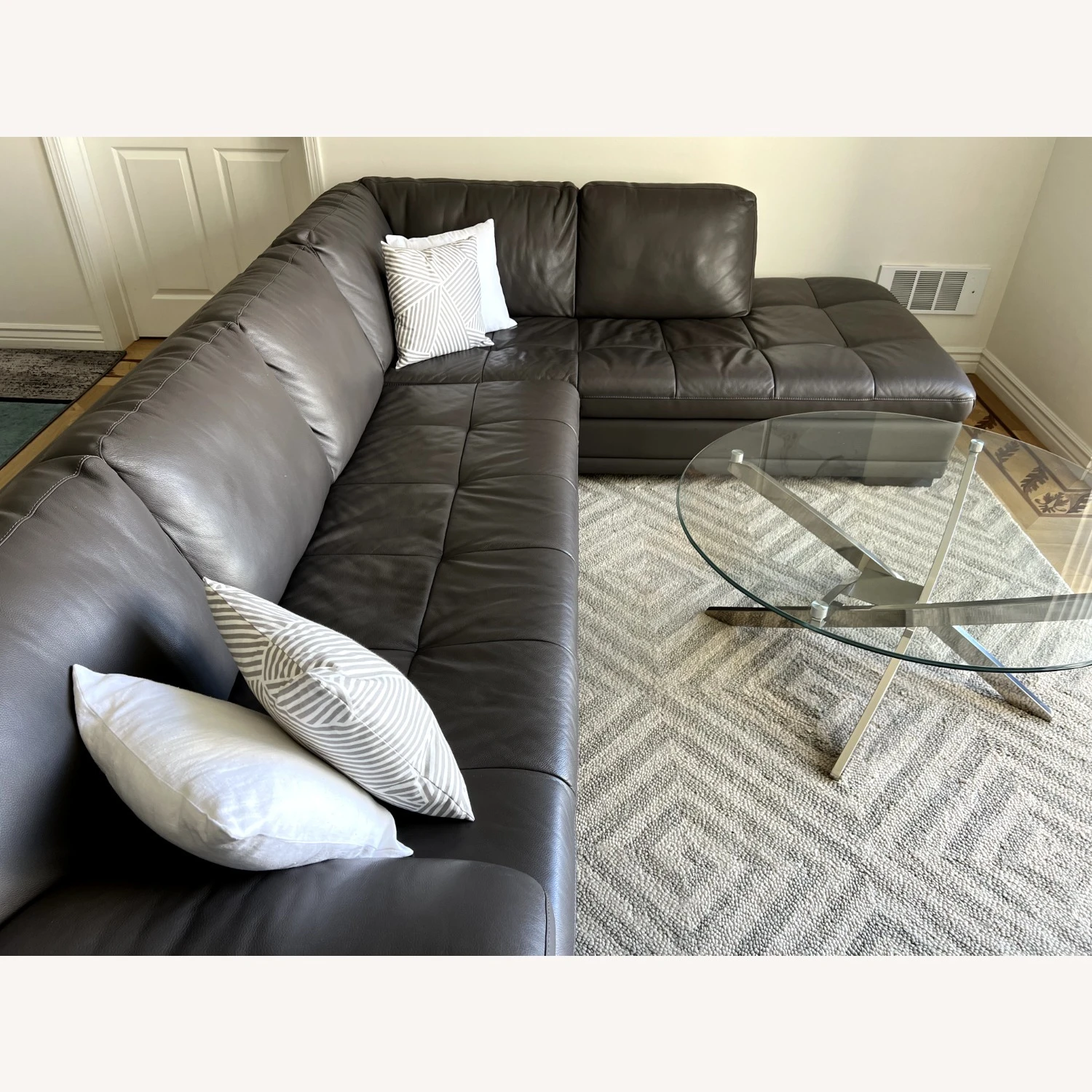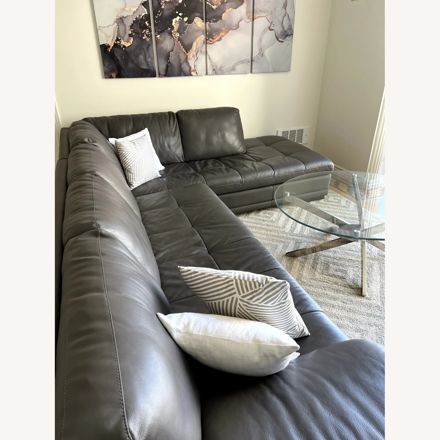 Seller’s Notes: This modern grey sectional is in excellent condition and would be a great addition to any living room. The sectional is made of a durable material that is easy to clean and maintain. It is also very comfortable and can accommodate up to 6 people.