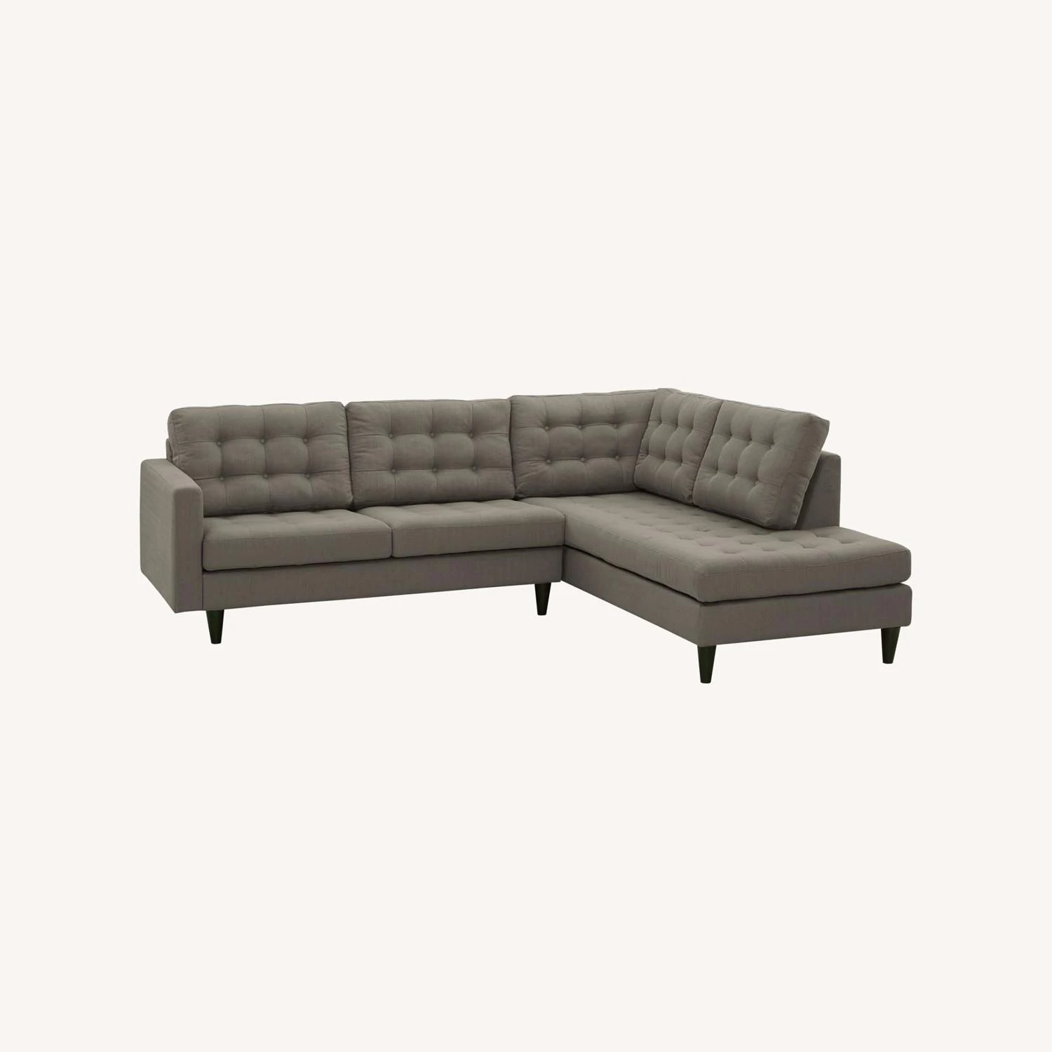 • This is a 2 piece right facing bumper sectional sofa set heralded with deeply tufted buttons, plush cushions, and armrests that convey that perfect air of nobility.