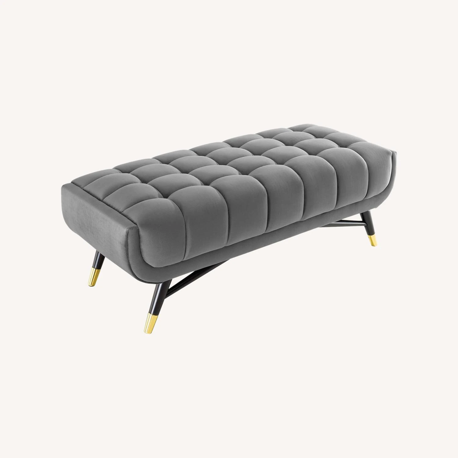 • Featuring a blend of chic, contemporary, and mid-century modern design, this bench’s broad profile, generous tufting, stain-resistant performance velvet polyester upholstery, and subtle metal accents imbue rich detail and chic sophistication.