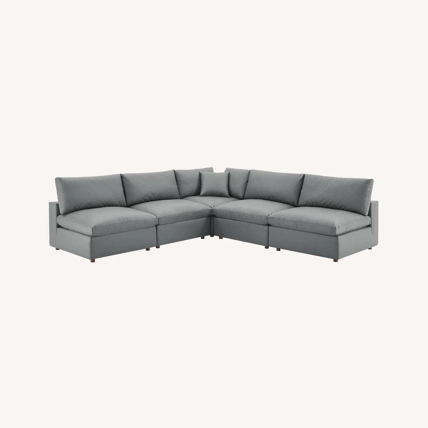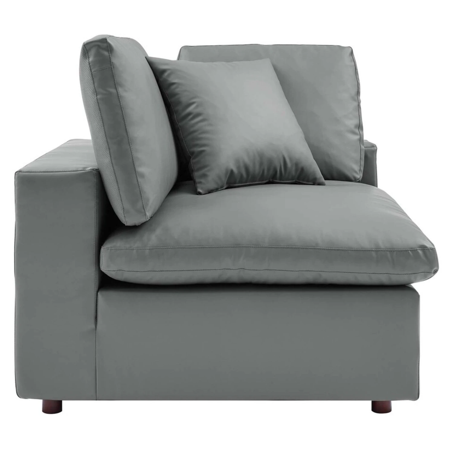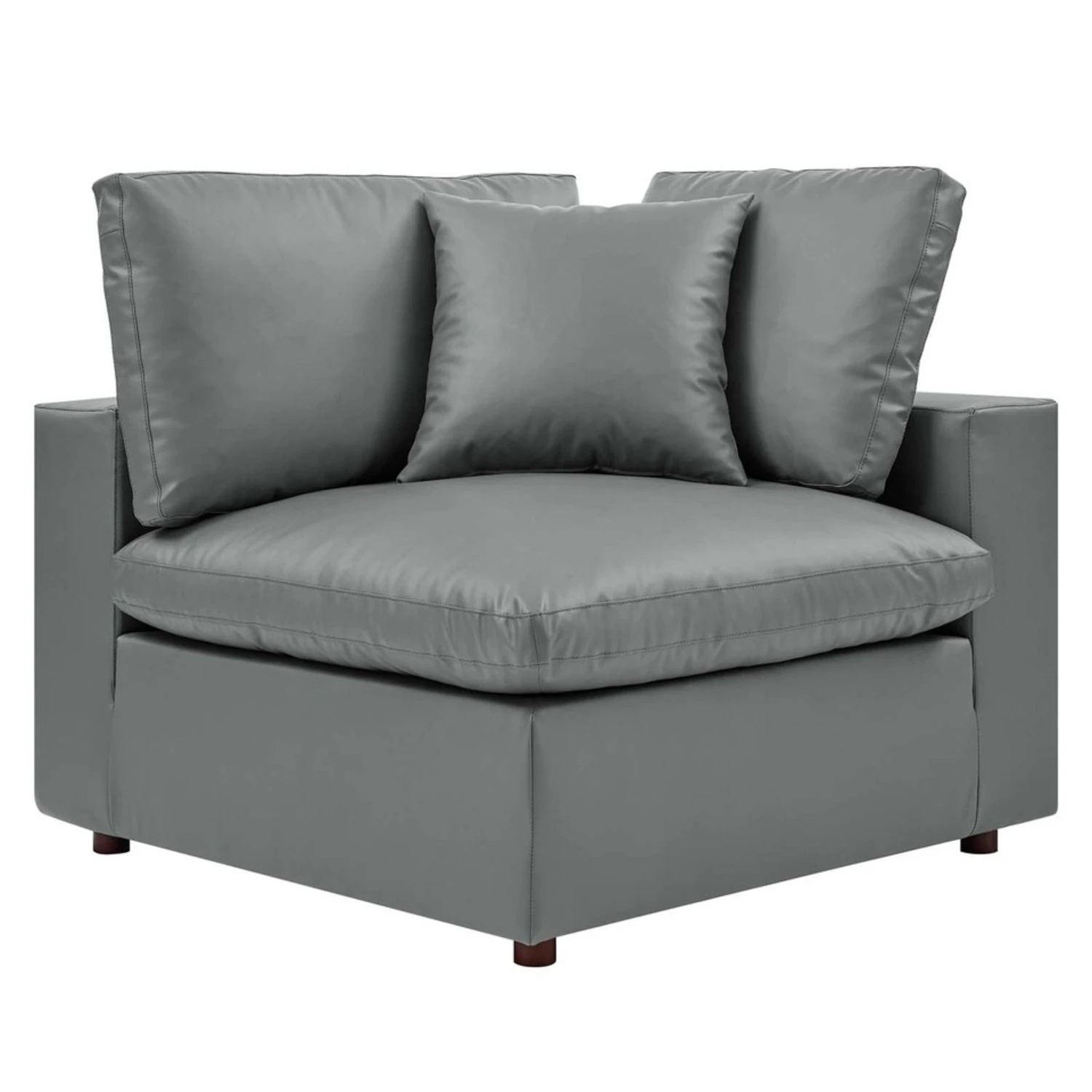 • Covered in vegan leather, this upholstered sectional sofa comes with a solid wood construction and foam padded and duck down cushions for a luxurious sink-in feel.