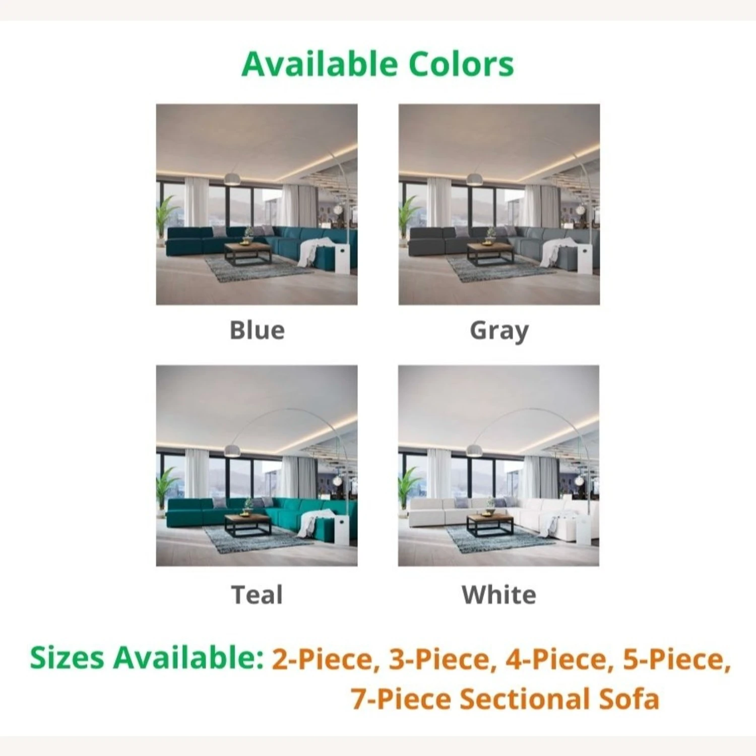 This model comes in these BLUE, GRAY, TEAL, and WHITE, and these sizes: 2-PIECE, 3-PIECE, 4-PIECE, 5-PIECE, and 7-PIECE SECTIONAL SOFA. If you are interested in a color/size other than that of this listing, and if the quantity you wish to purchase is greater than what is listed here, please message us for availability.