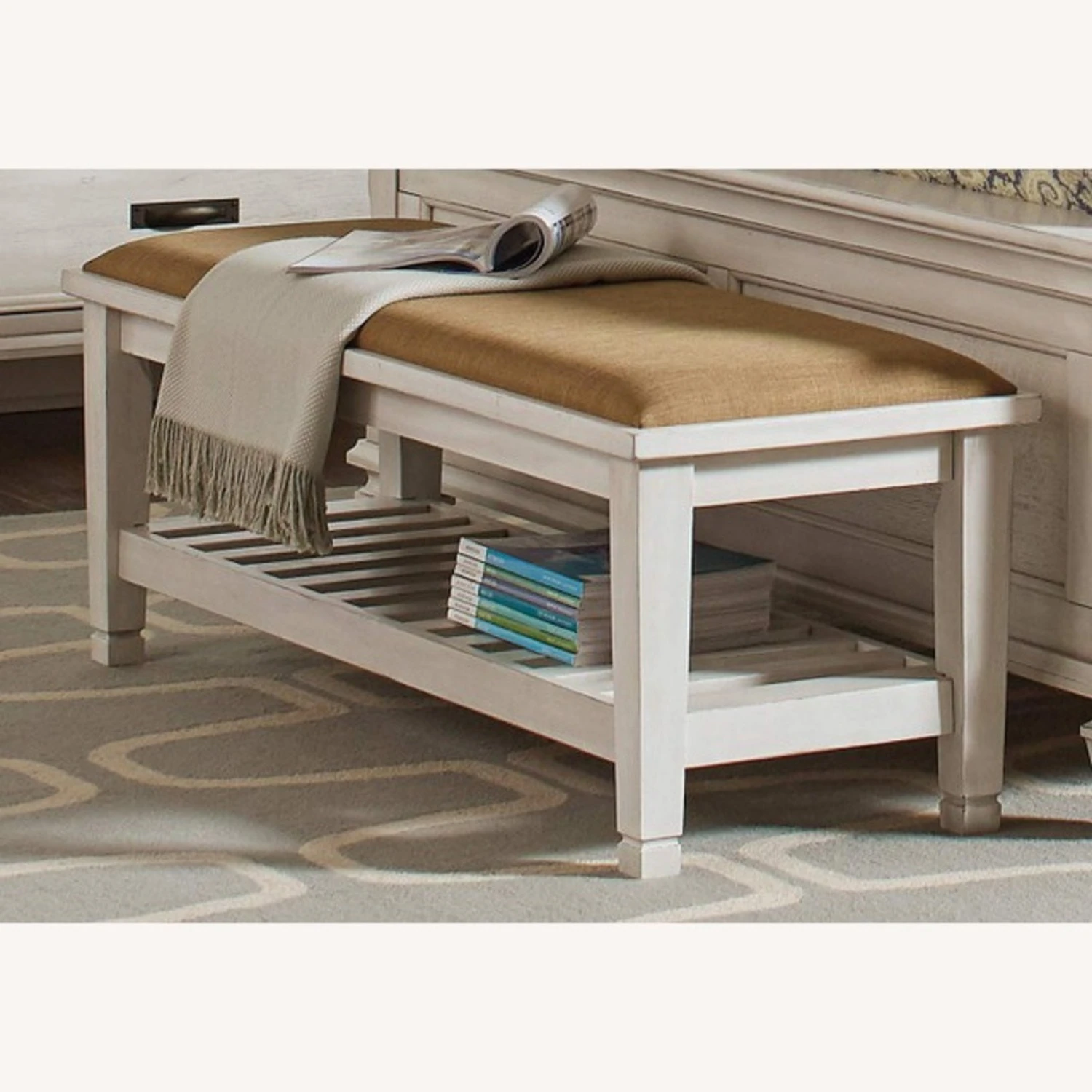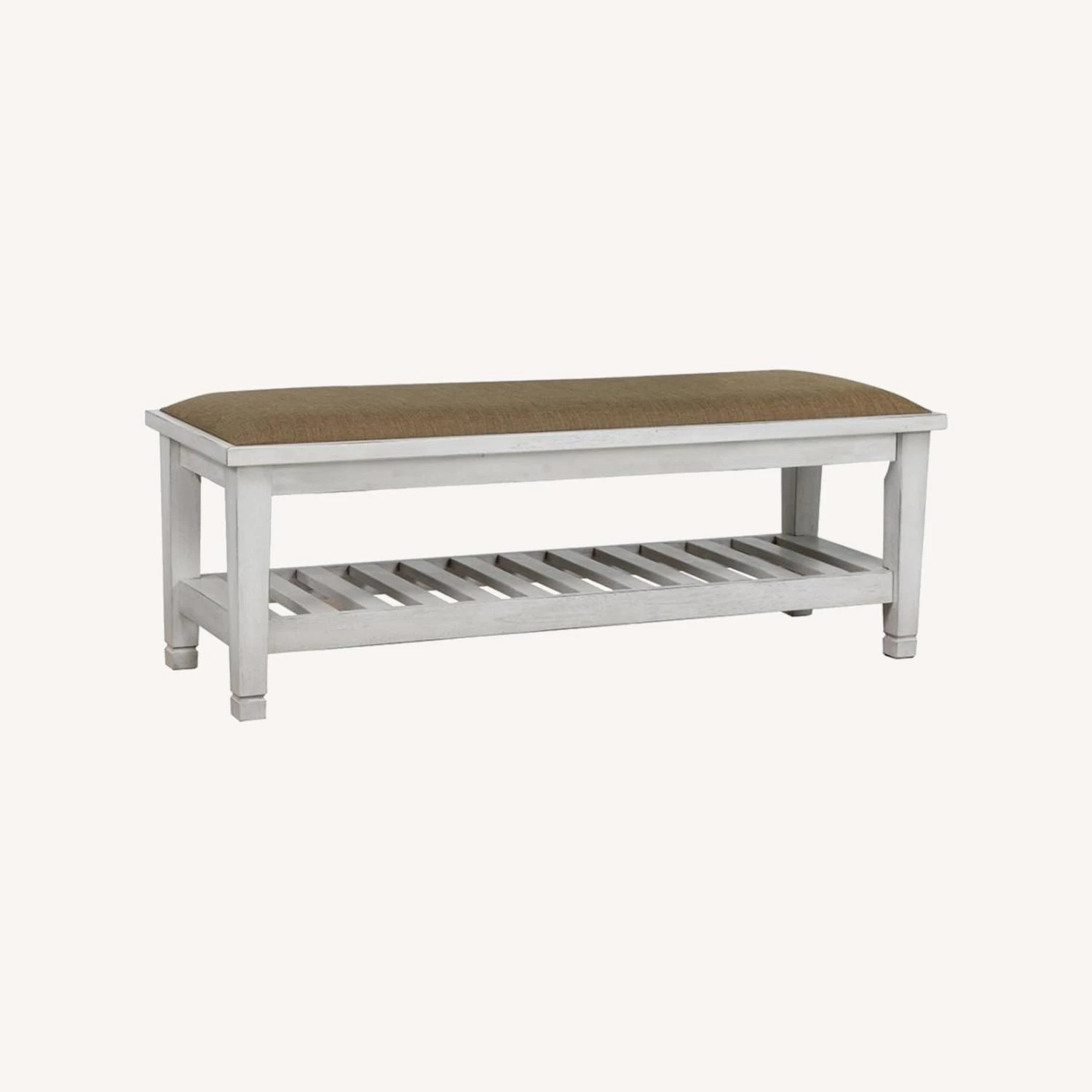 • Warm painted finish in antique white with a hint of grey accents wire-brushed white oak veneer