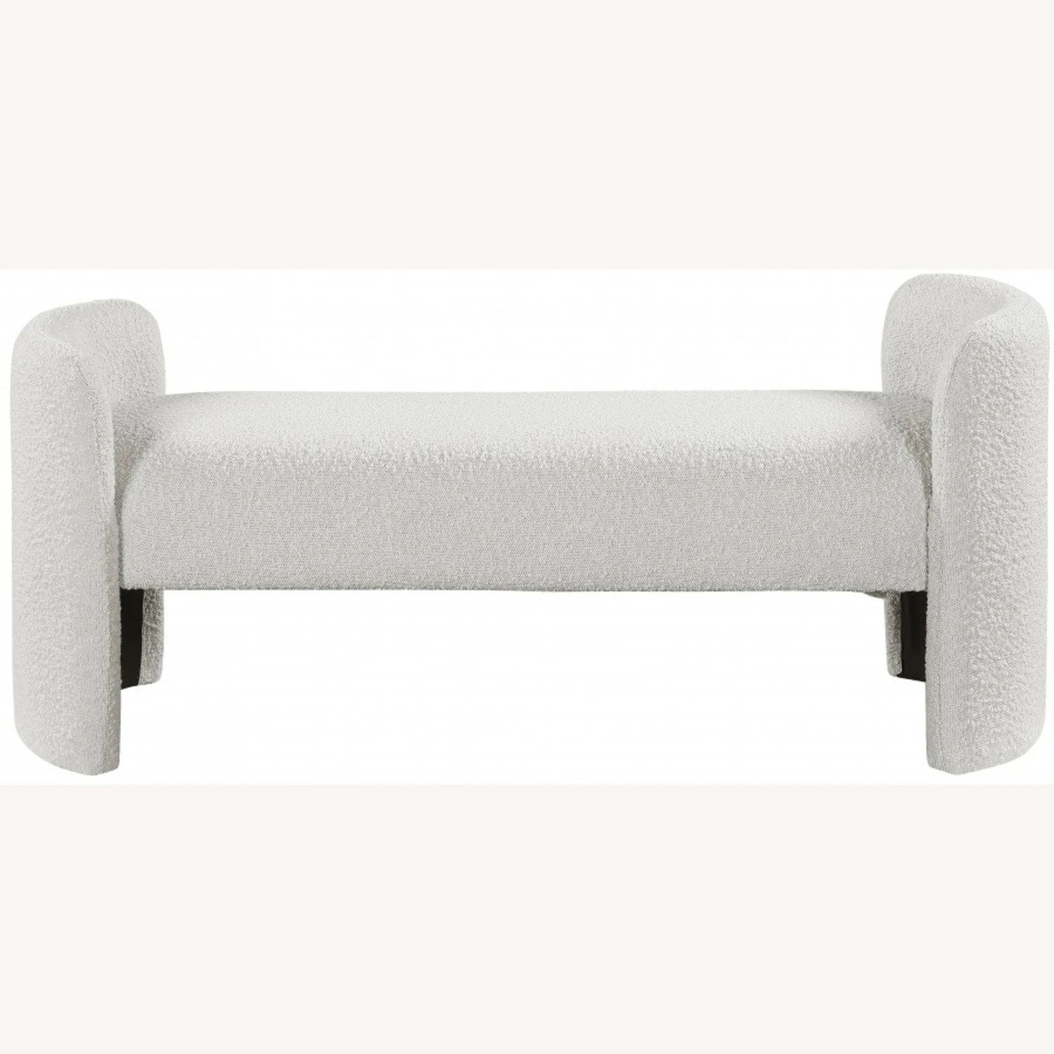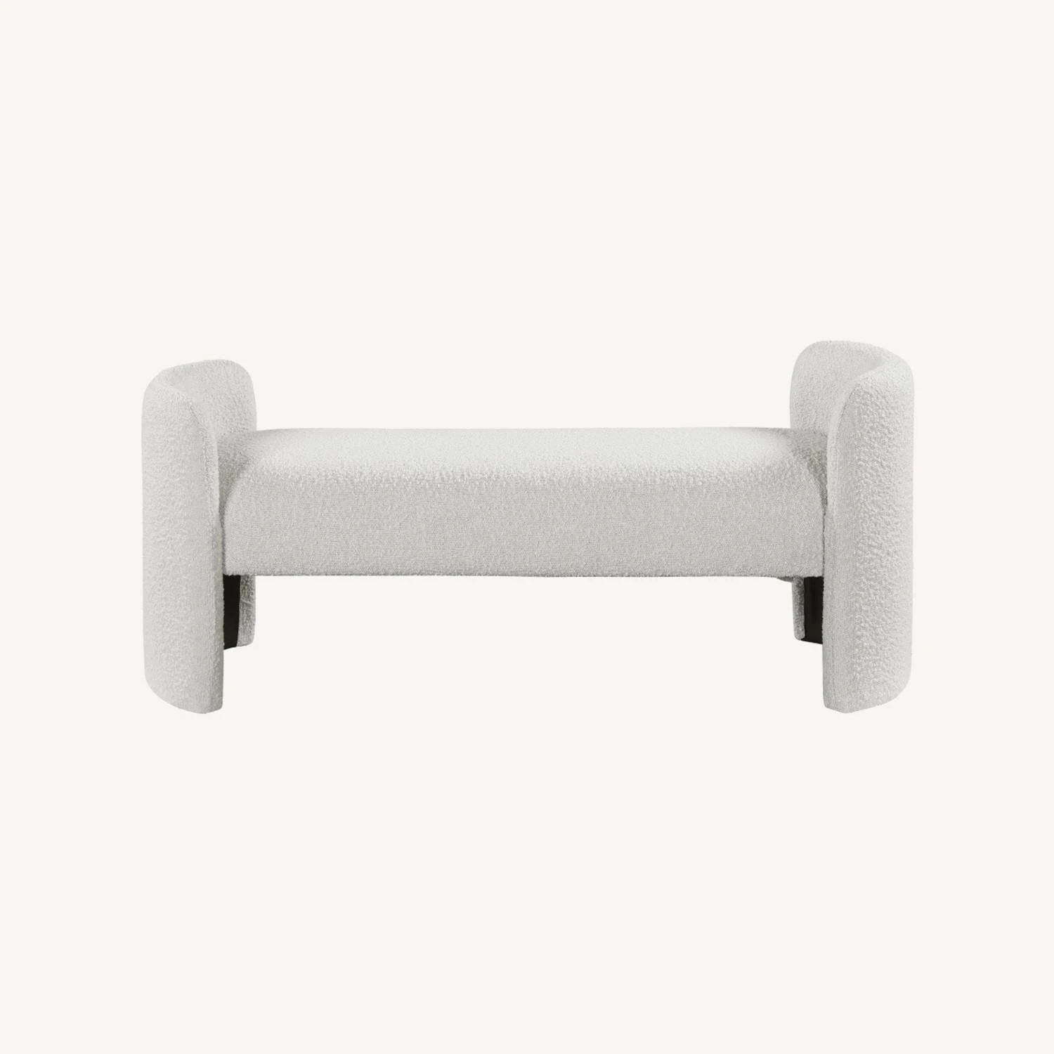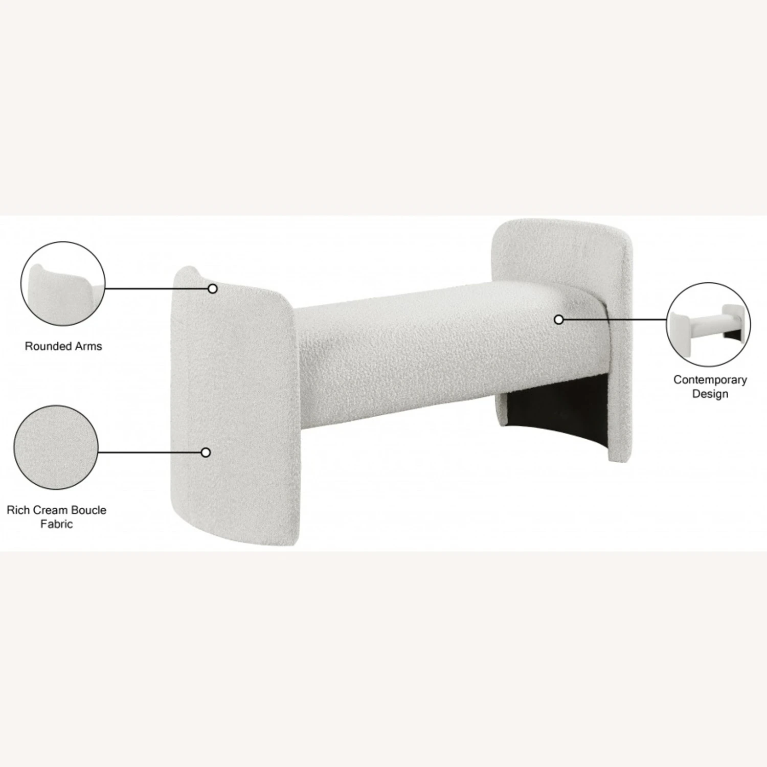 • The rounded arms and the non-assuming style lend this bench an air of contemporary panache while the rich cream boucle fabric lets it easily mesh with your room’s color scheme.