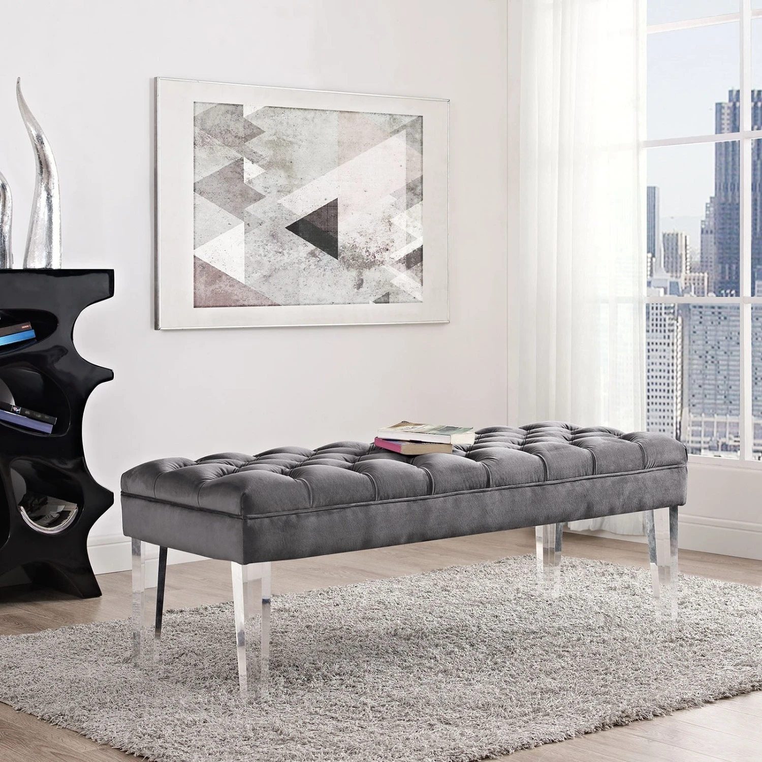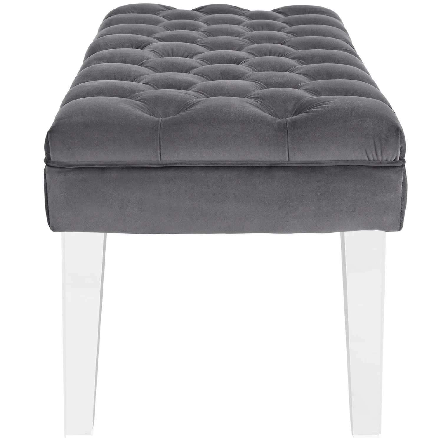 • Easy on visual space and elegantly chic, this comes densely padded in foam with four clear acrylic legs.