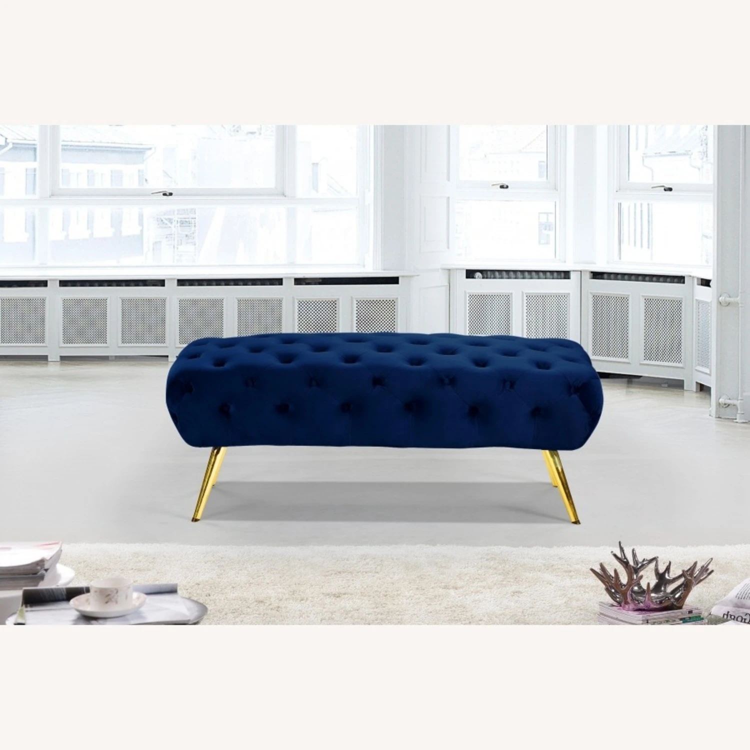 • Inject Hollywood glam into your space with this Navy Velvet Bench.