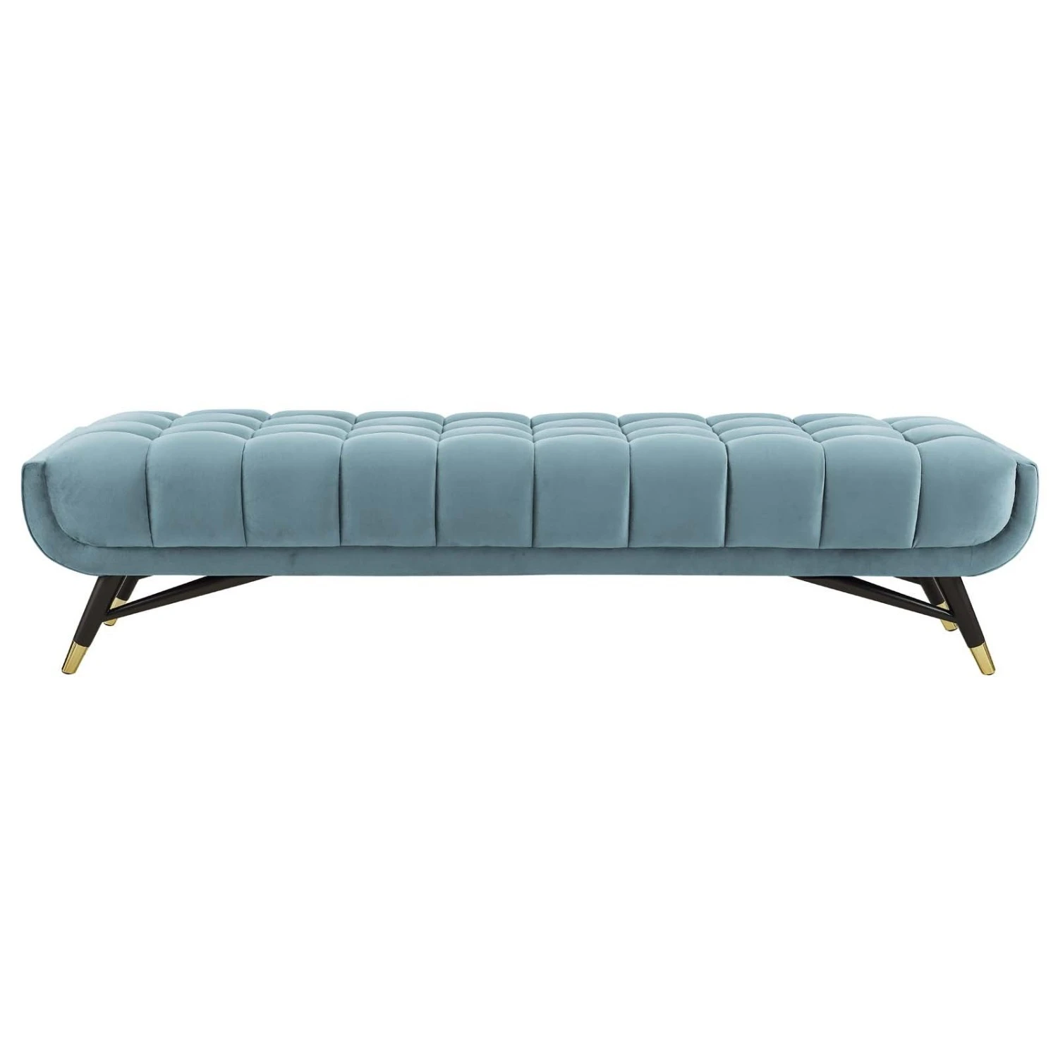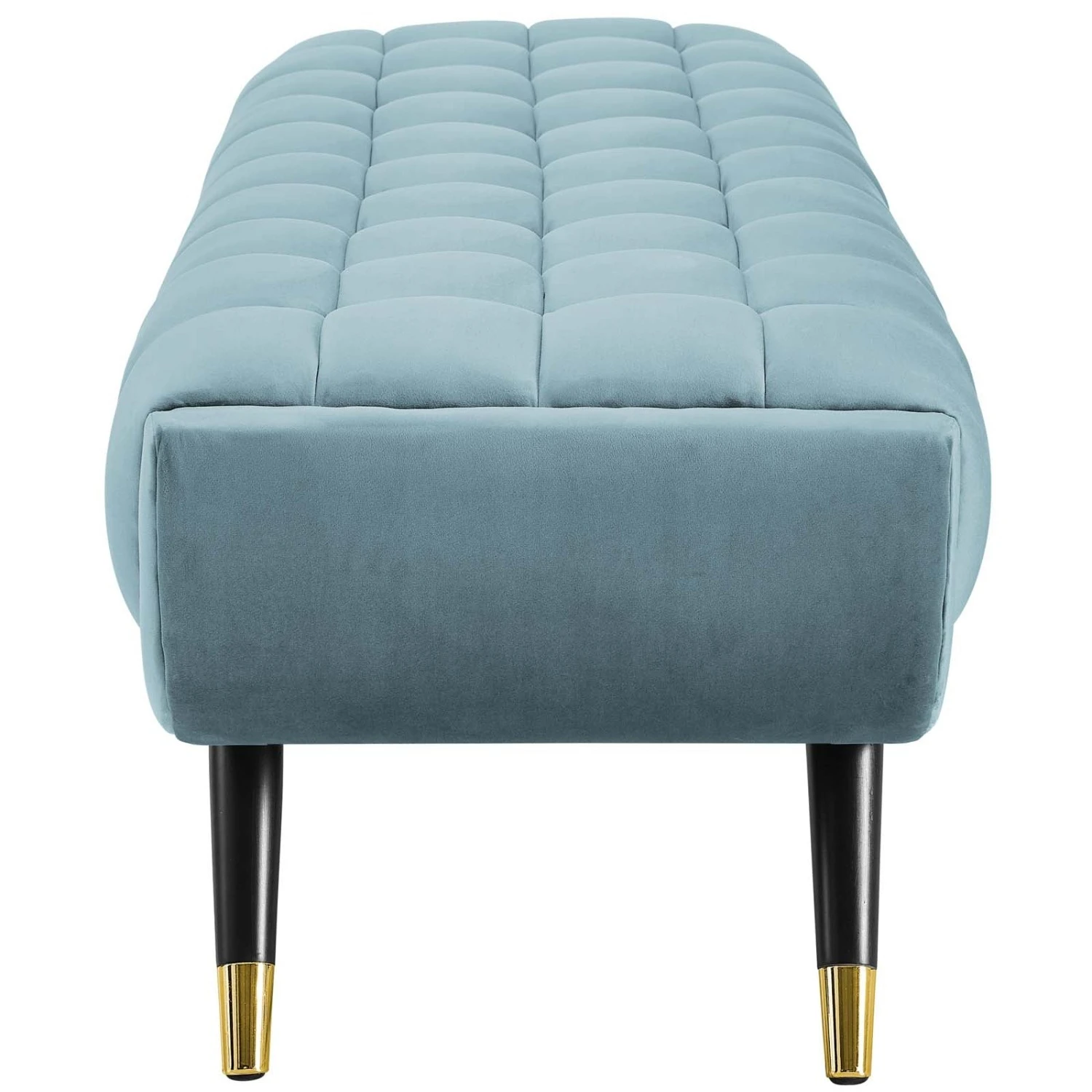 β’ Featuring a blend of chic, contemporary, and mid-century modern design, this bench’s broad profile, generous tufting, stain-resistant performance velvet polyester upholstery, and subtle metal accents imbue rich detail and chic sophistication.