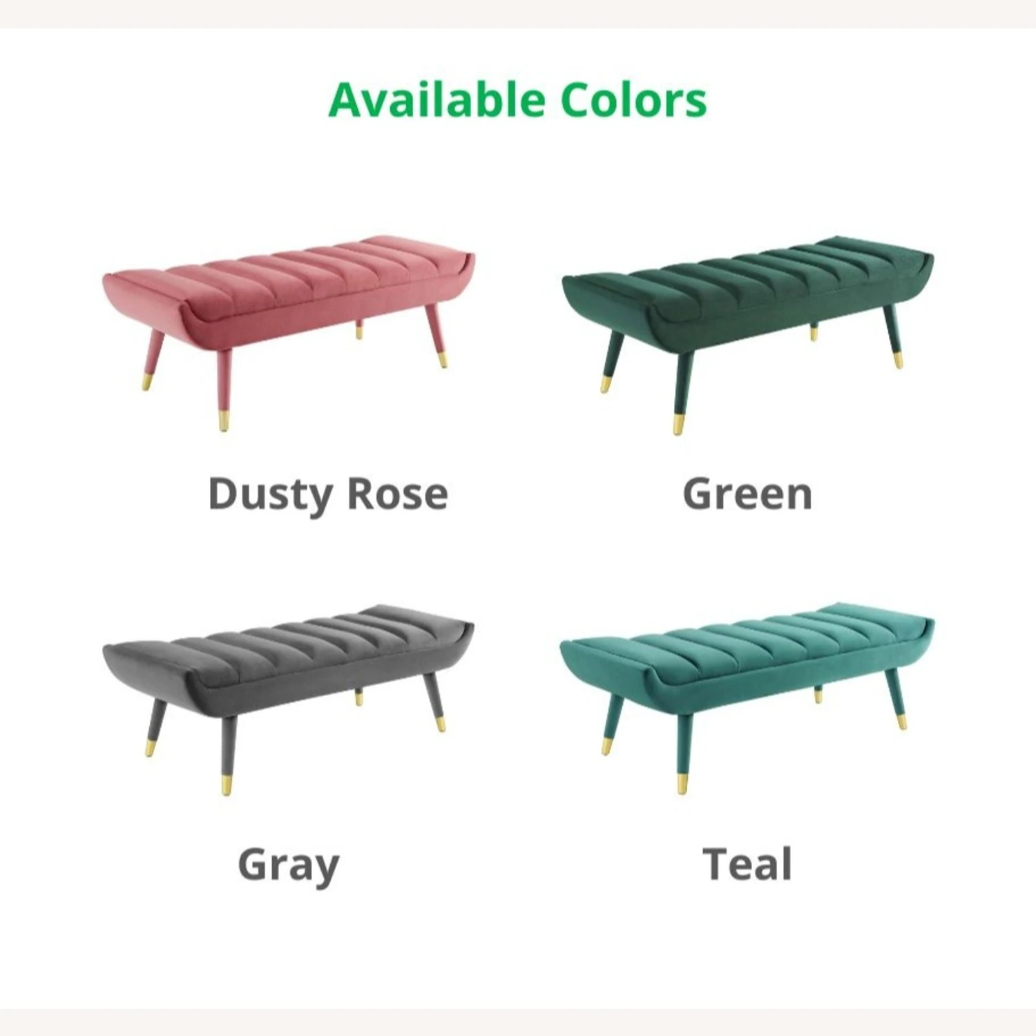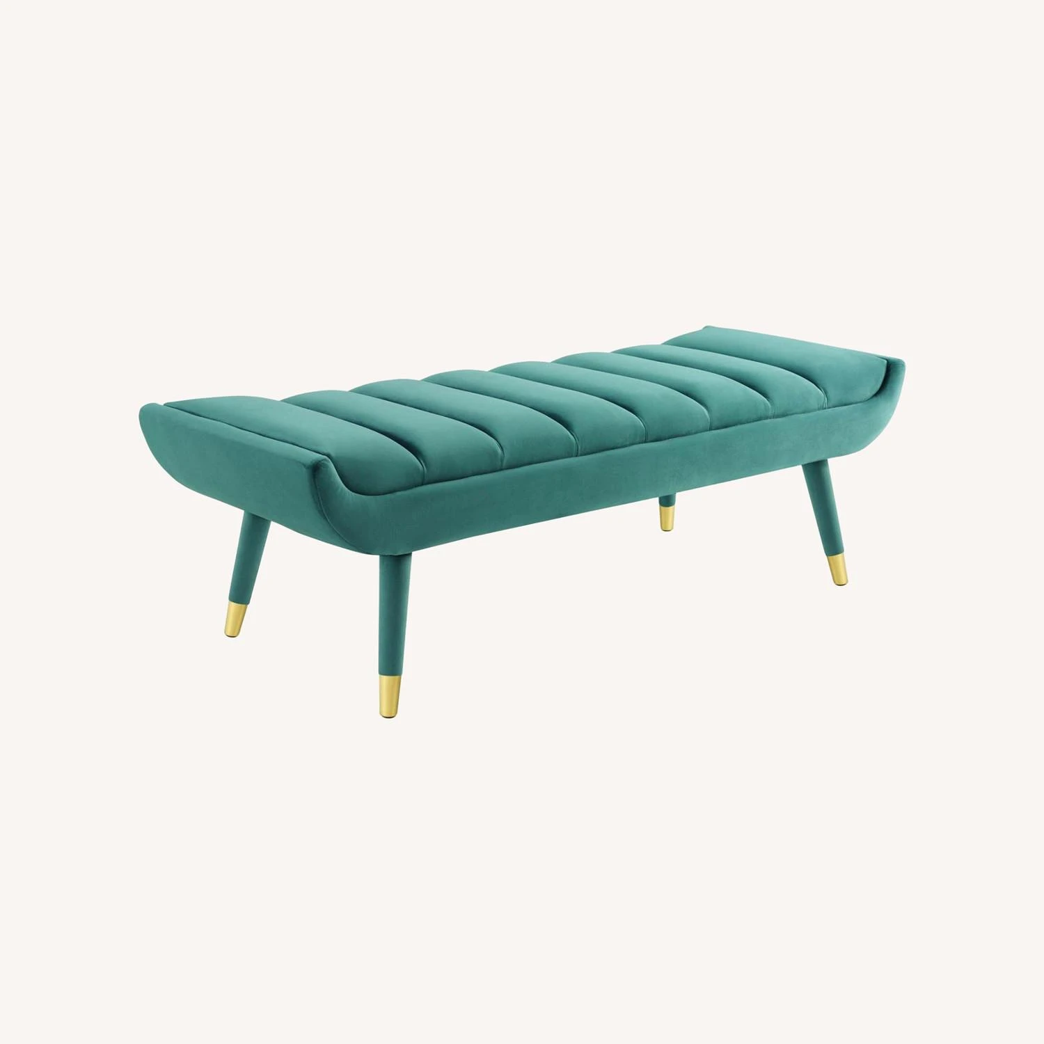 • This bench is comprised of a solidly constructed rubberwood frame resting on four tapered birch legs covered in matching velvet upholstery with gold metal foot sleeves for that perfect artisan touch.