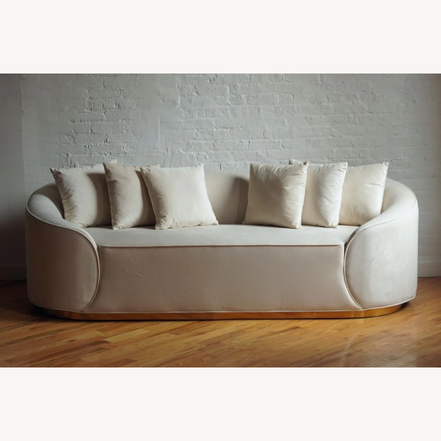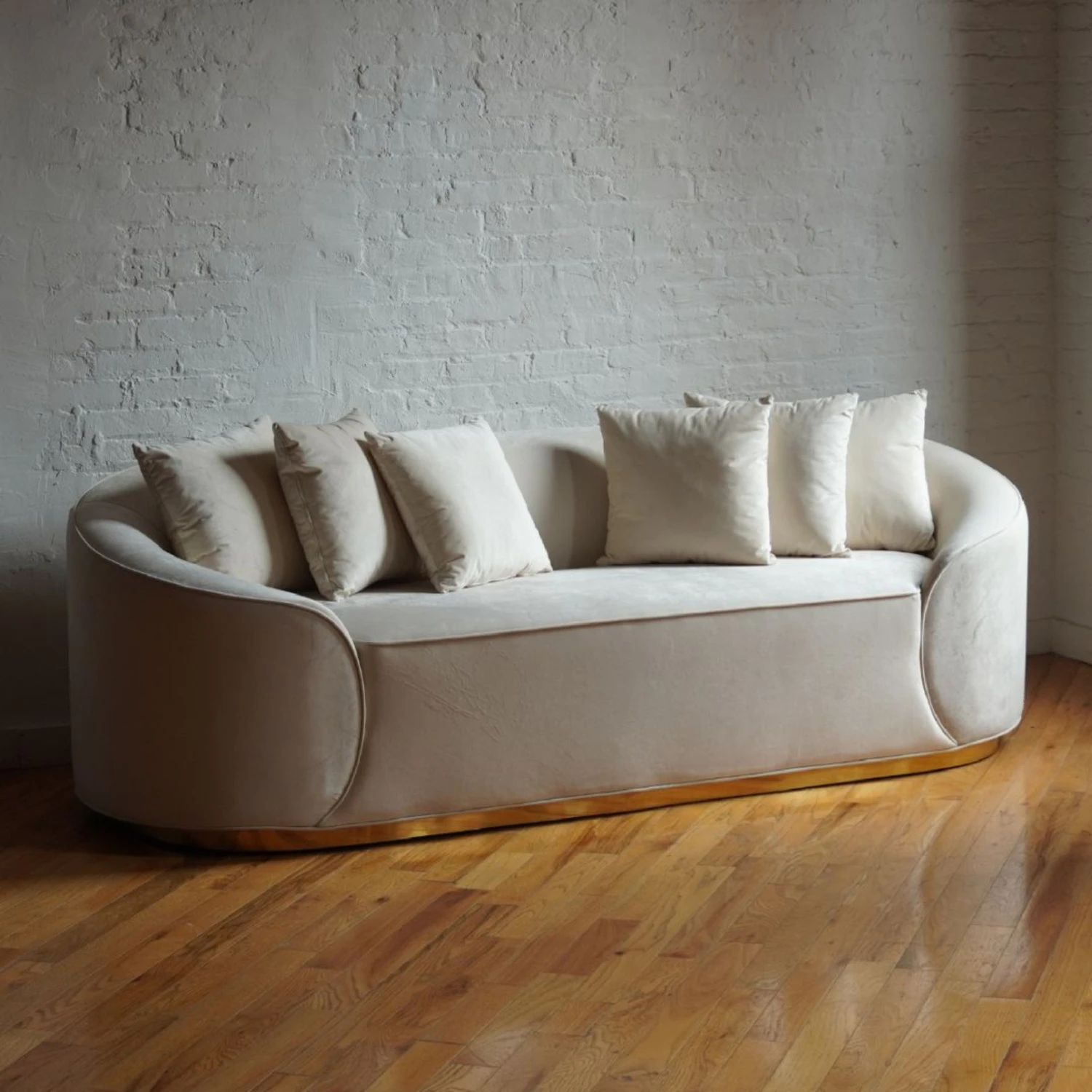 Seller’s Notes: The graceful, gently curved back and arms of the Simplicity Sofa are soft and minimalistic, creating a simple, feminine silhouette. Donโt be fooled by the curves and pillows though; the seating on this modern sofa is a surprisingly firm foam core, and it all sits sturdily on our sleek brass frame. Monochromatic welts along the edges are a sophisticated touch.