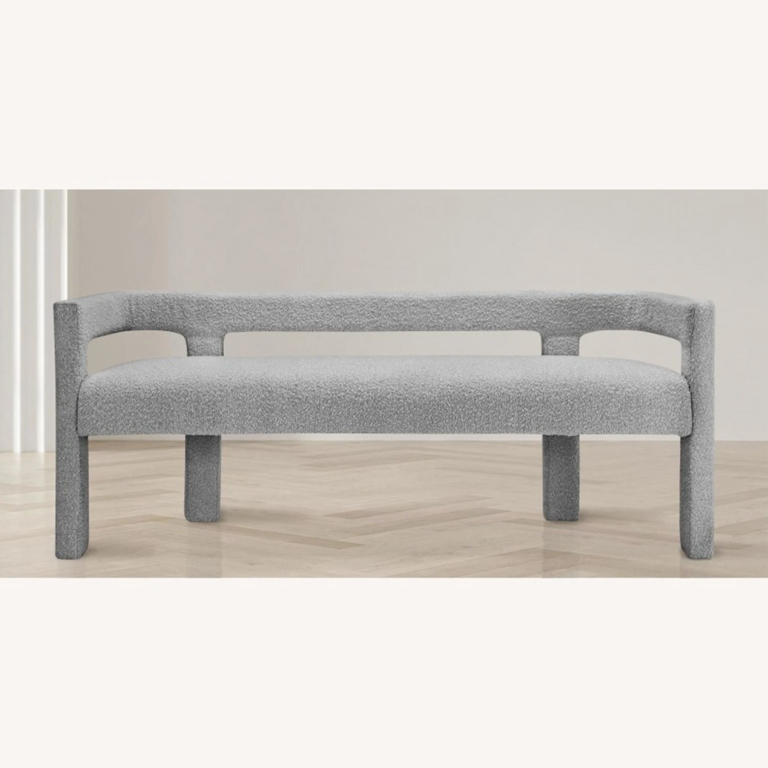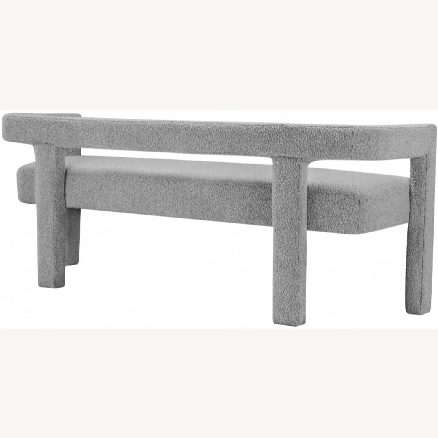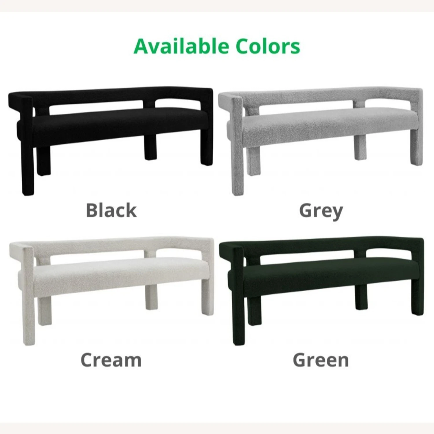 • The bench is covered top to bottom in rich green boucle fabric, so it’s super soft to the touch and elegant to the eye.
