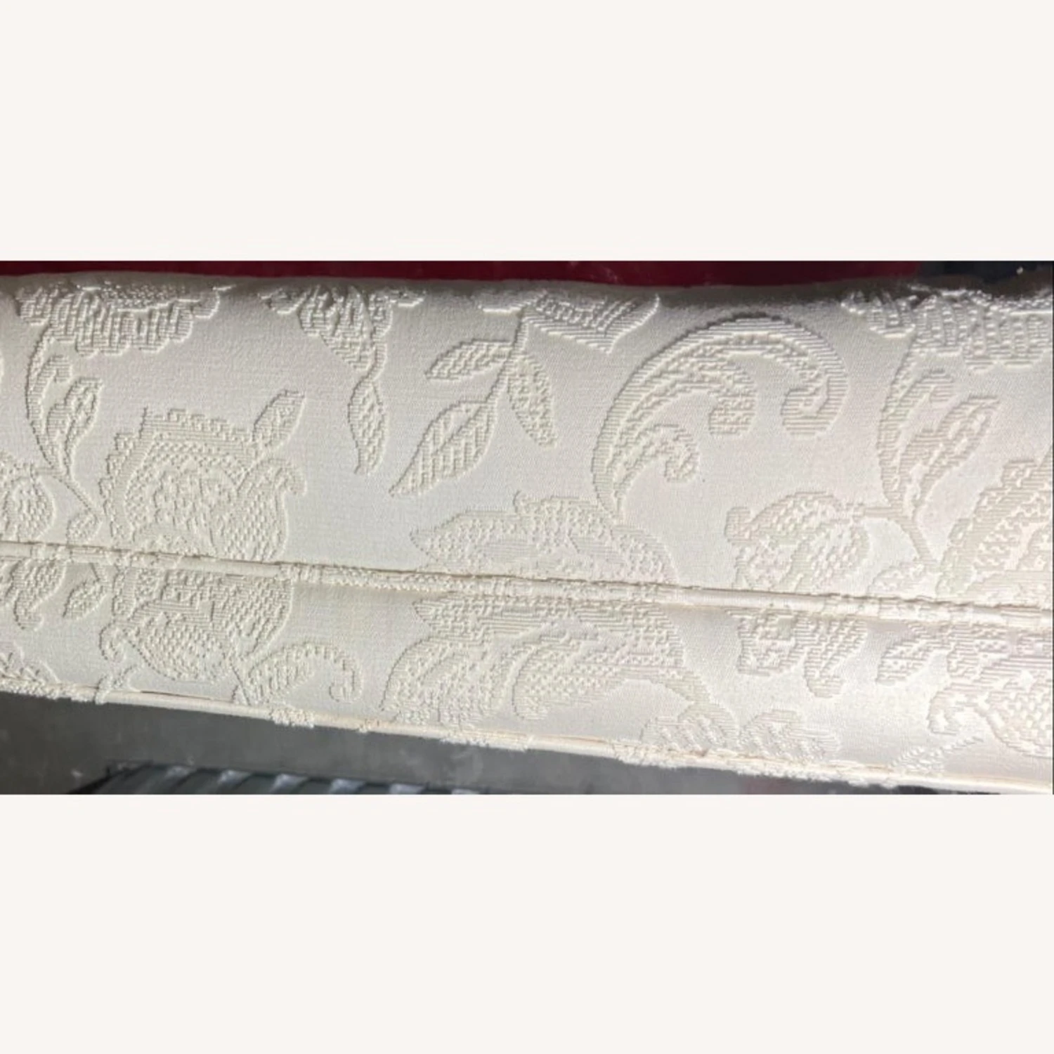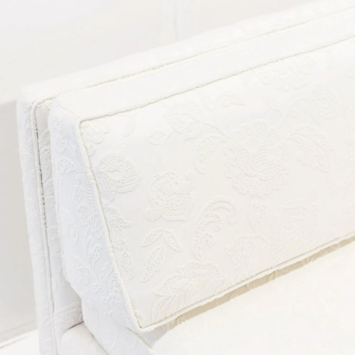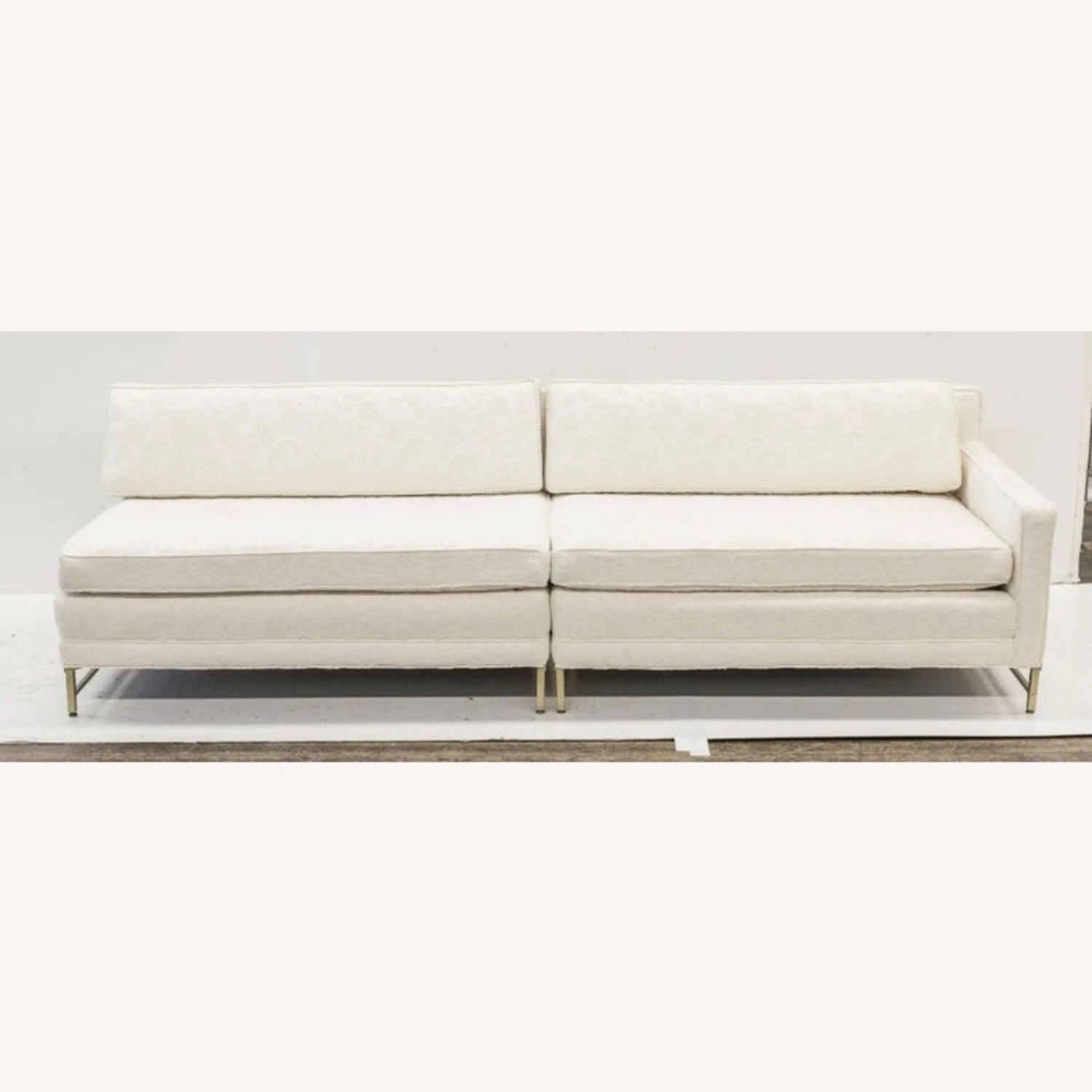 Seller’s Notes: Paul McCobb for Directional, two piece sectional sofa, c 1958. Cream on cream minimal Jacobean floral textile and solid brass. Two parts can be used together as one long sofa or as separate pieces. Gorgeous lines and minimal modern design. Single cushions for seat and back delineate each part but come together to form a sleek, neatly symmetrical (yet one-armed) sofa, comprised of a armless