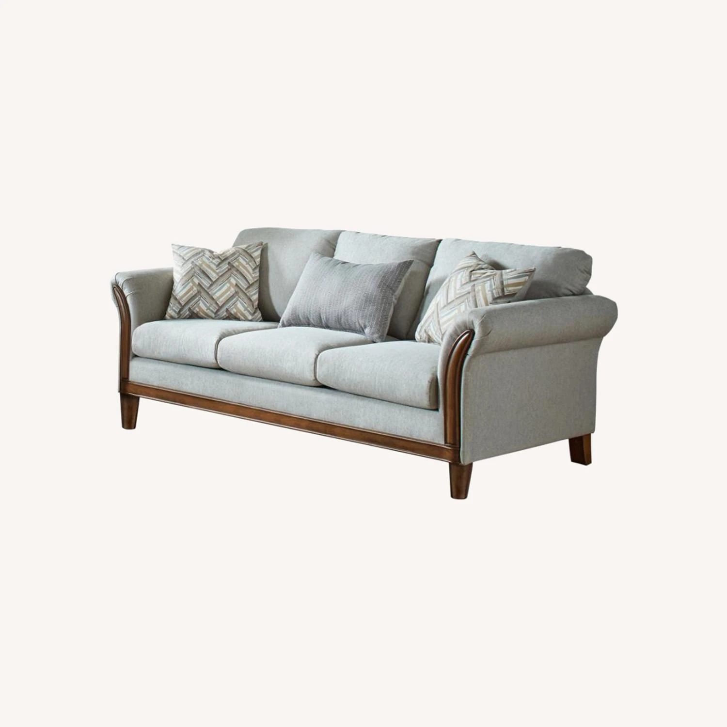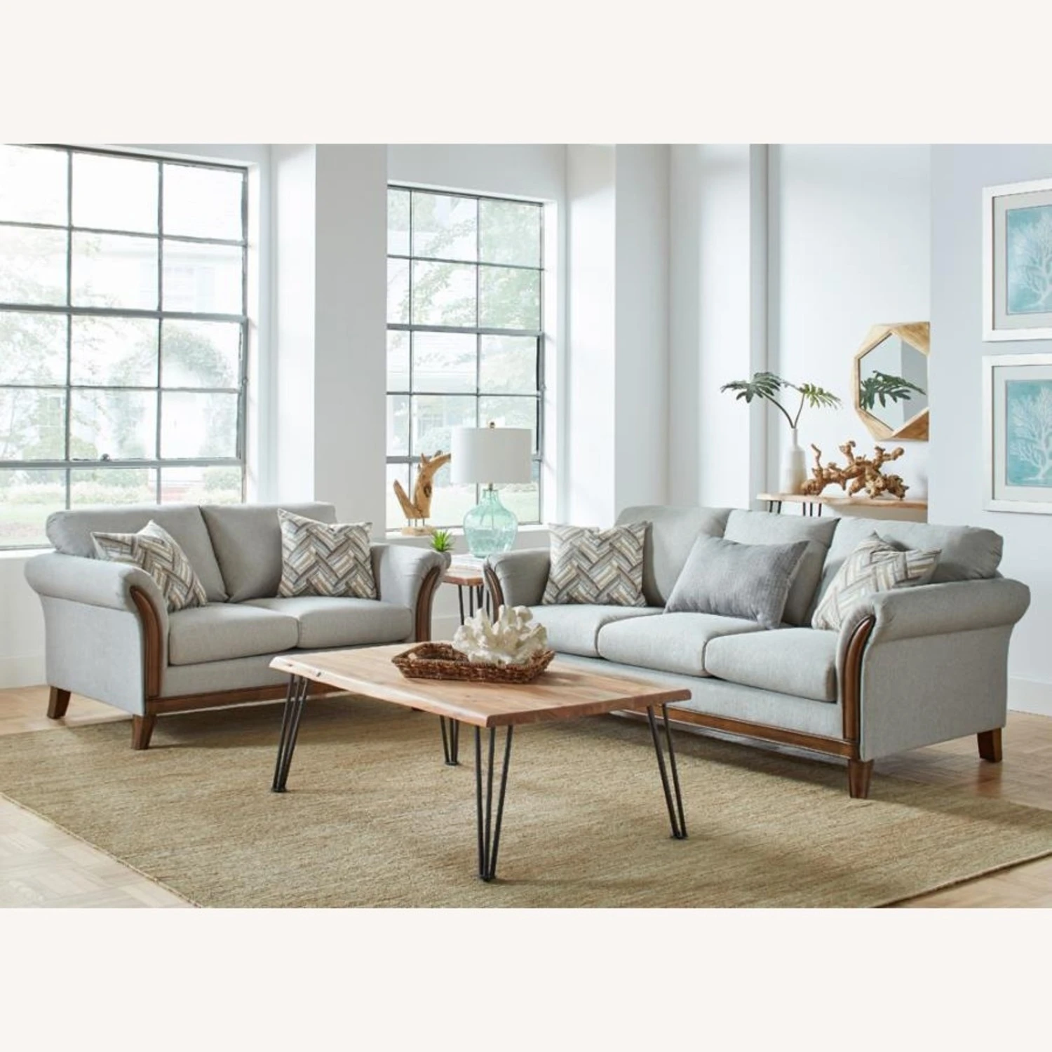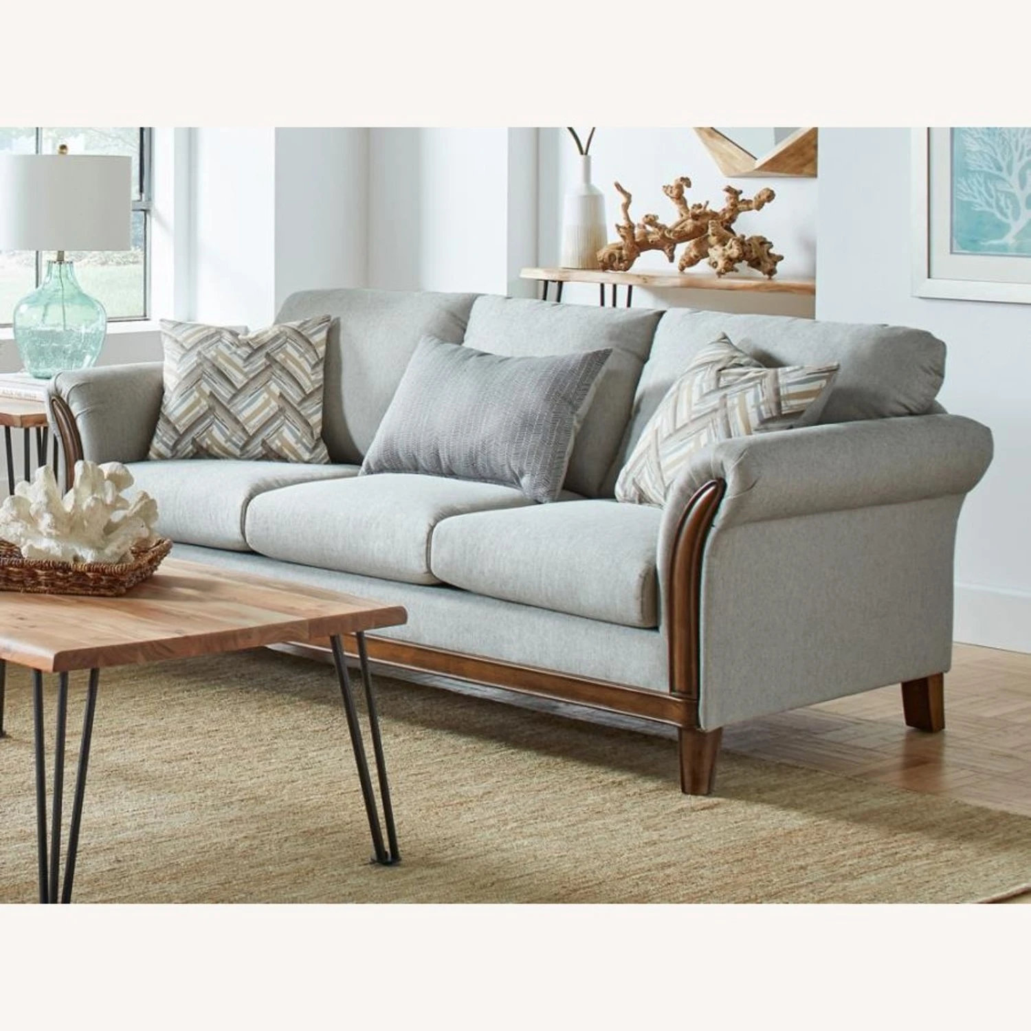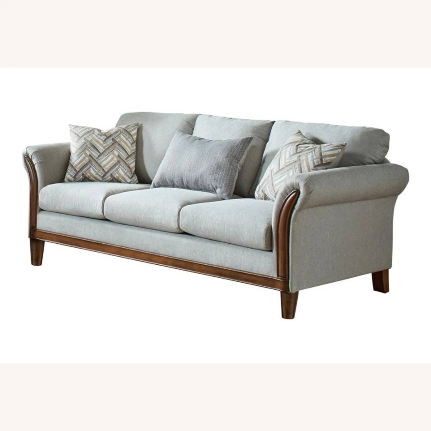 • A blend of earth tones with soft shades of teal blue compliment the lightly textured upholstery
