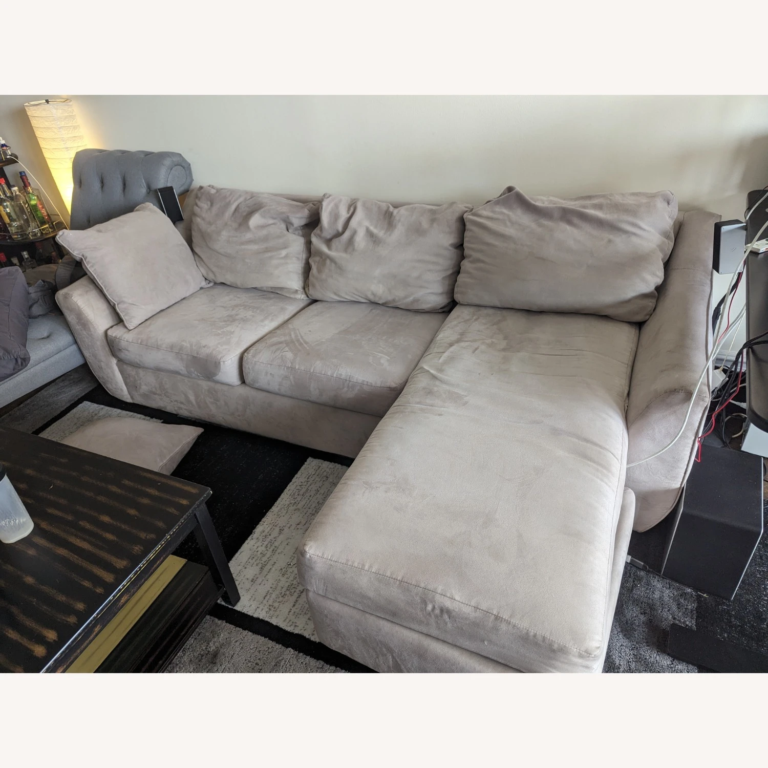 There are a few stains (likely removable with the right device), and the back cushions are a bit floppy but it still works great.