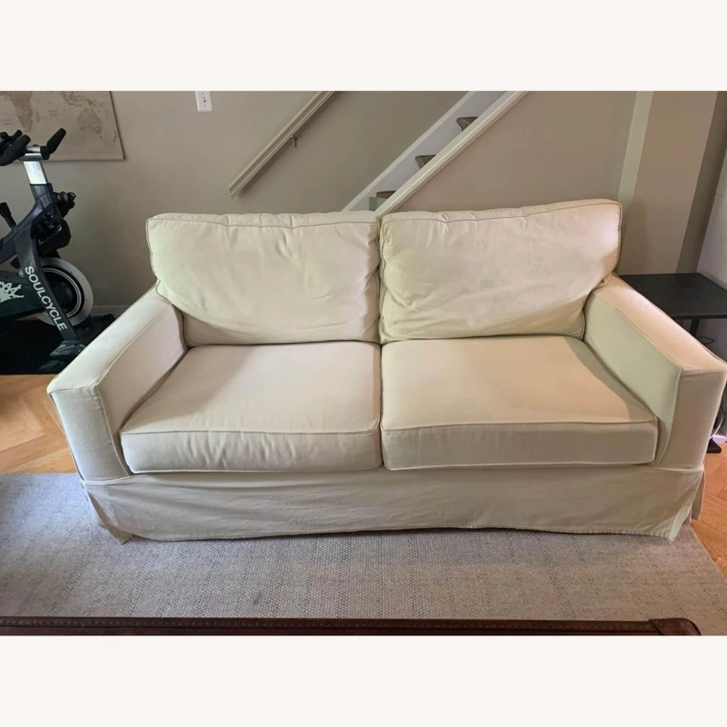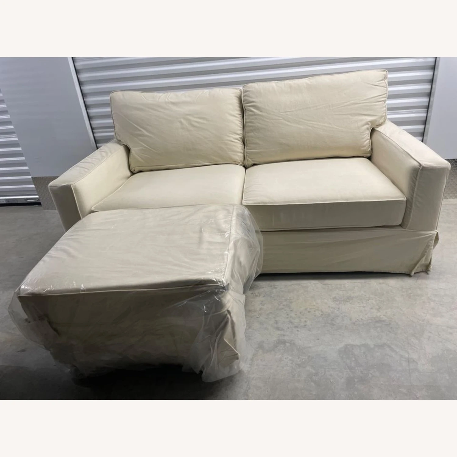 Seller’s Notes: We have had this sofa for almost two years and it is very comfortable. The slipcover can be removed and washed for easy cleaning! Comes with a matching ottoman.