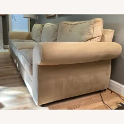 Seller’s Notes: Cognac color, Pottery Barn by Mitchell & Gold full top-grain analine-dyed leather sofa, natural shadings and markings, the cushions have natural wear, no tears or cuts. The frame is hard-wood, kiln-dried for durability over a long lifetime. The sofa has an angled back and streamlined curves. The leather panels emphasize the well-padded arms, and the high back and deep seat.