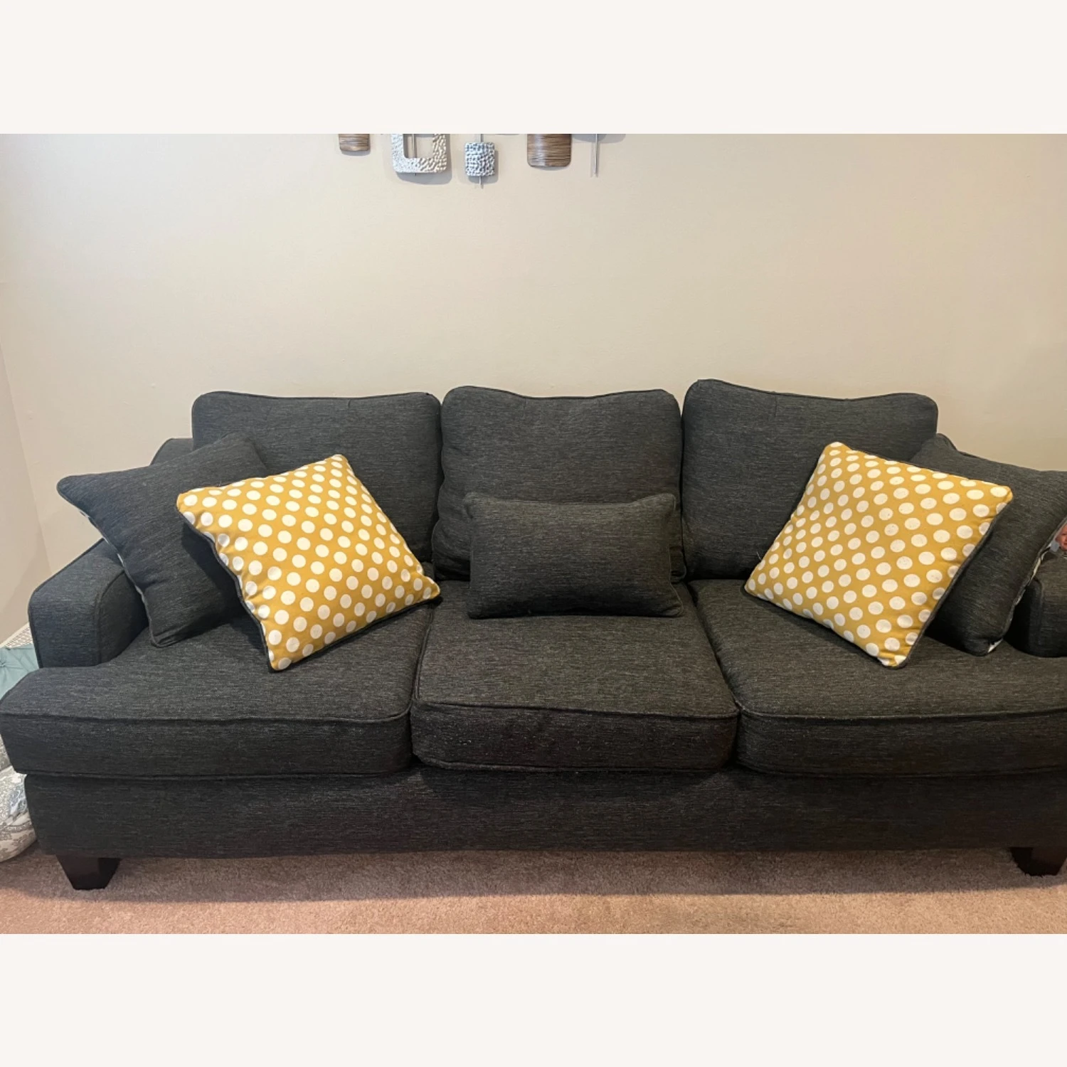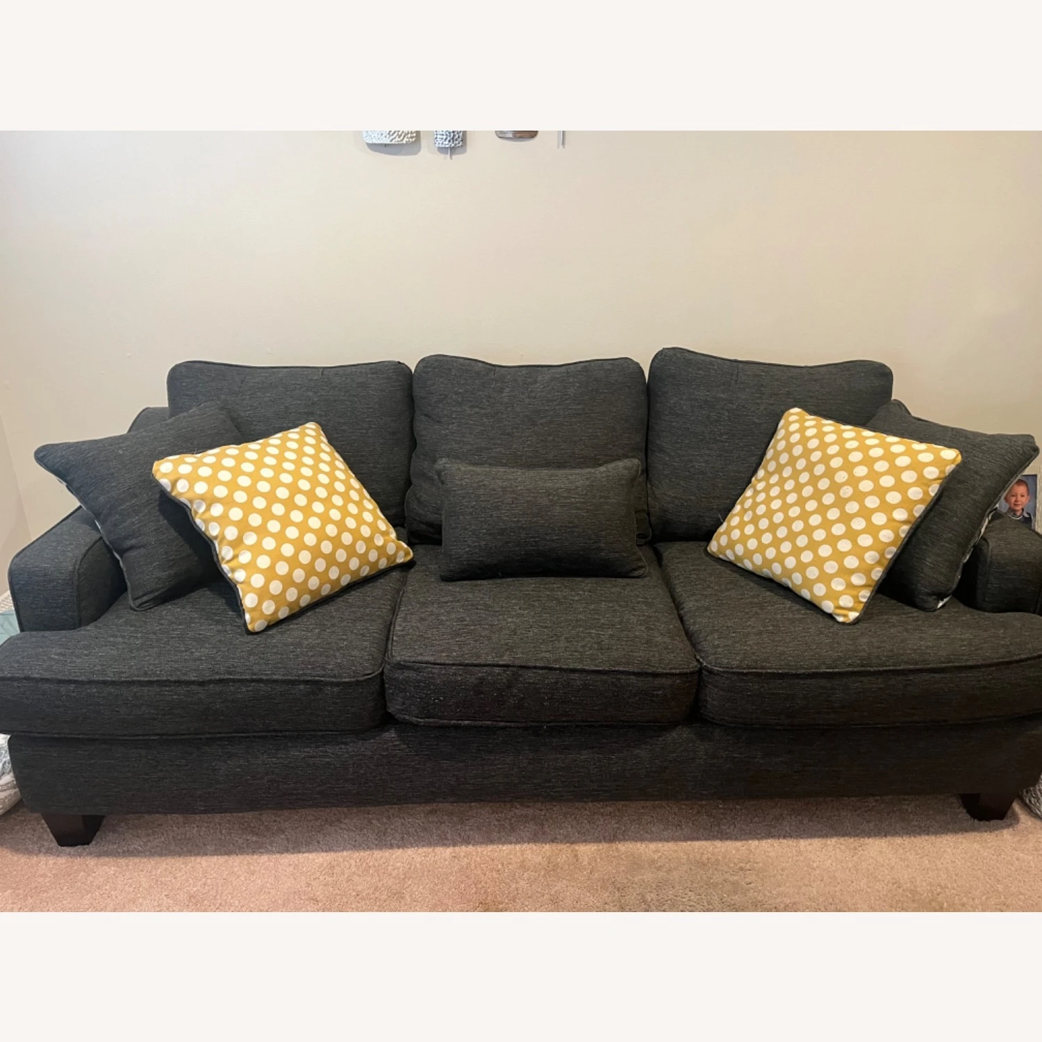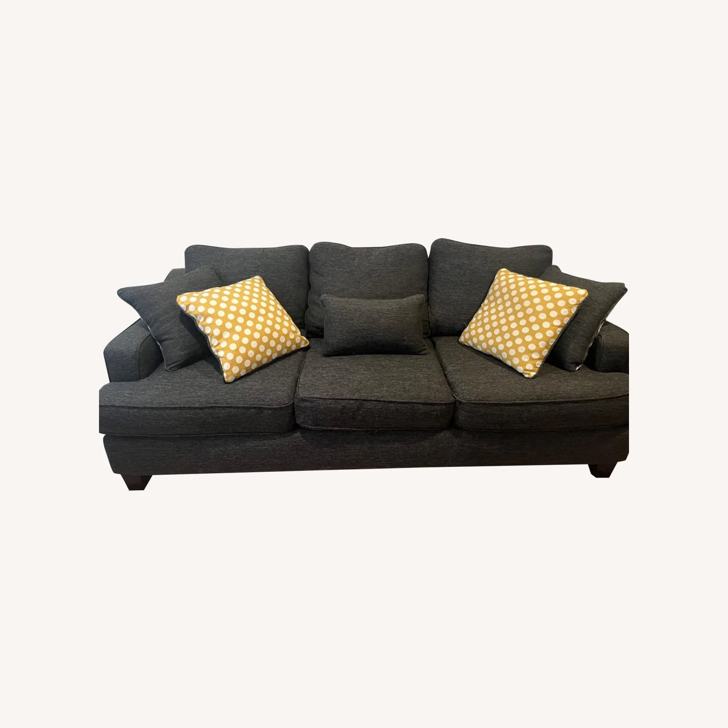 Seller’s Notes: This is a Raymour & Flanigan three seater sofa that has dark grey fabric material. It includes 5 pillows with a nice pop of color! Couch is very comfortable! The fabric is pilling slightly but otherwise is in great condition!