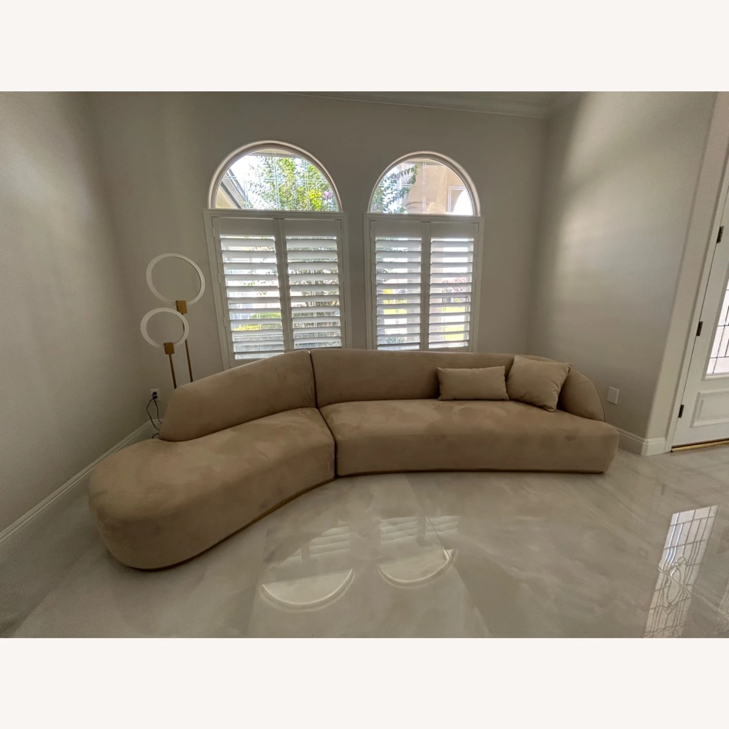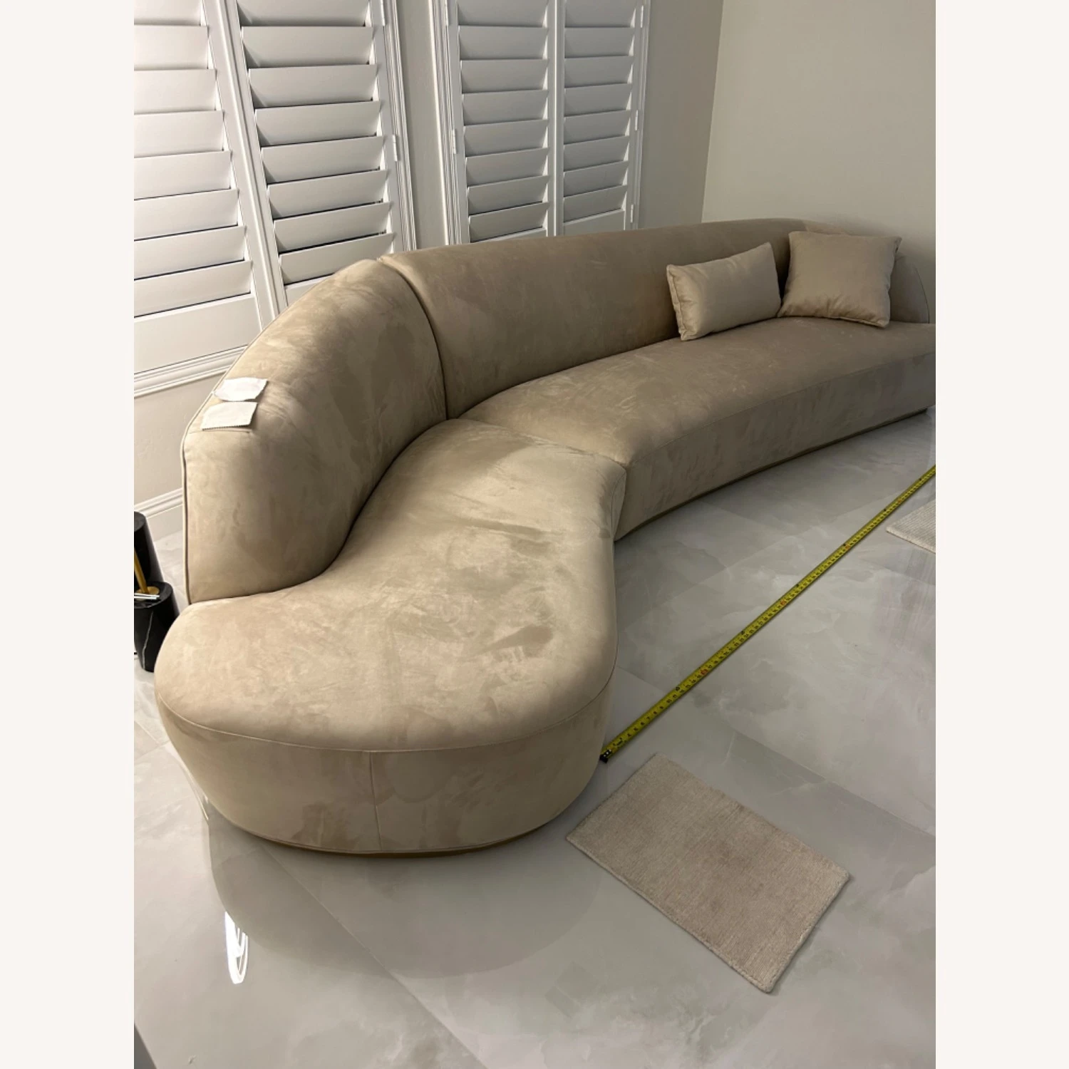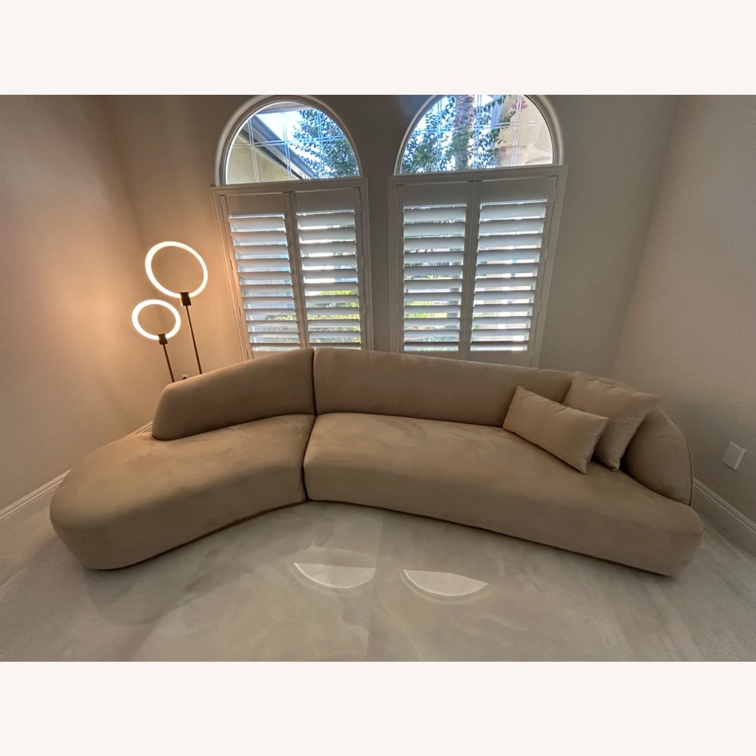 Seller’s Notes: Just delivered!Brand New Unused Rove Concepts Reyya custom ordered Sectional. Color “latte” Vegan Suede- 100% Polyester performance fabric. Luxury Modern sofa , partial down, beautiful in person. Unfortunately too large for my area?
