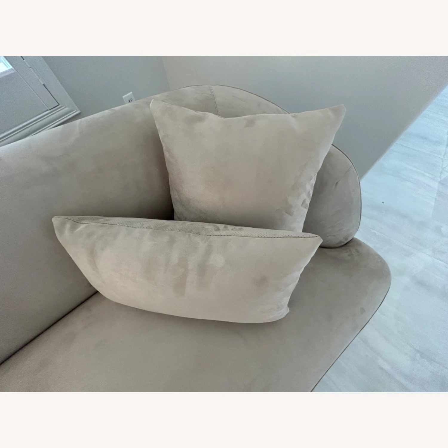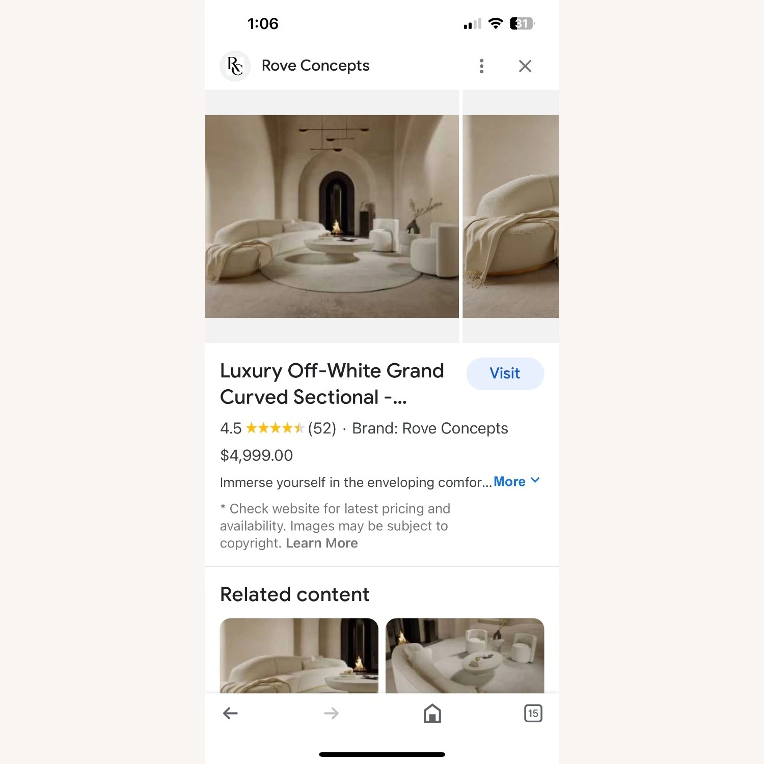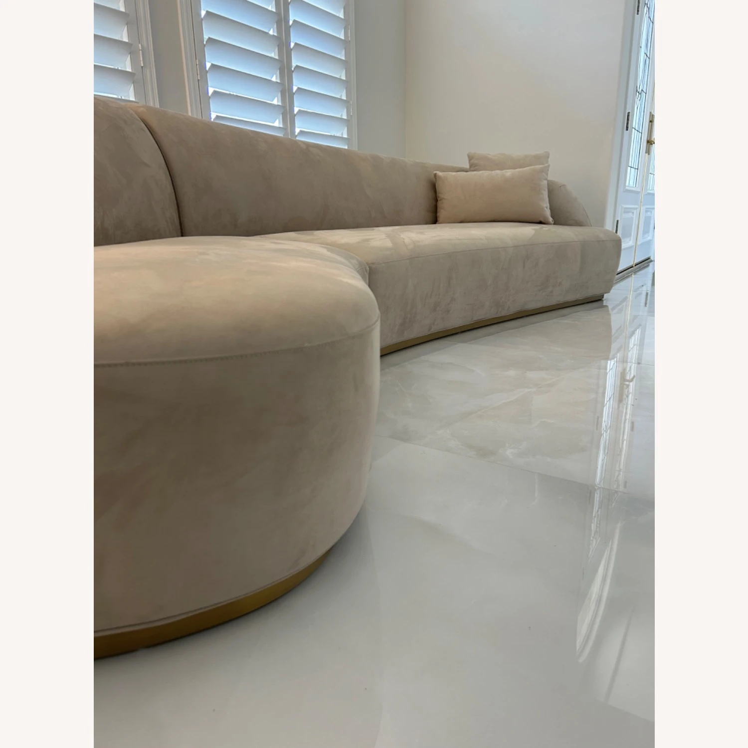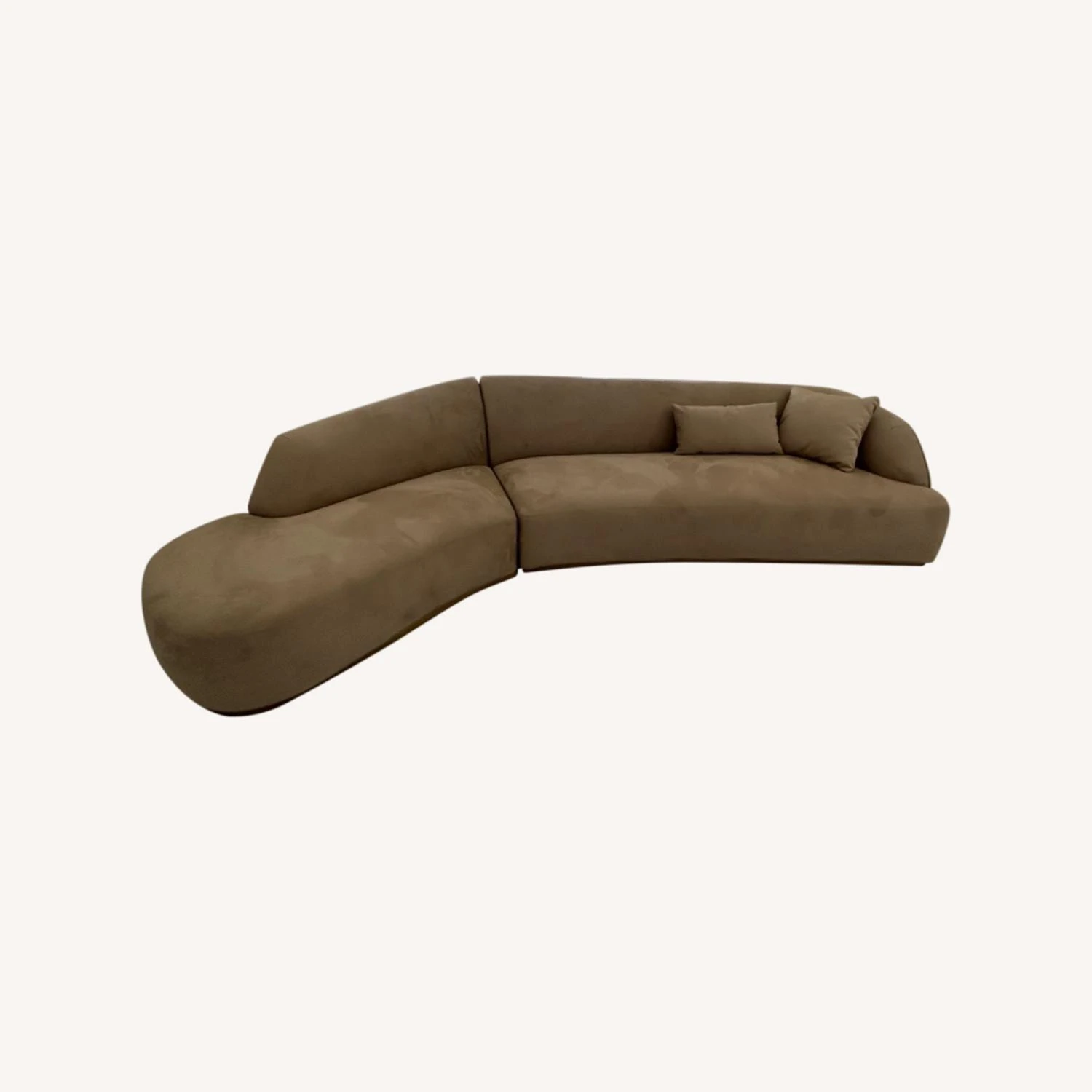 Seller’s Notes: Just delivered!Brand New Unused Rove Concepts Reyya custom ordered Sectional. Color “latte” Vegan Suede- 100% Polyester performance fabric. Luxury Modern sofa , partial down, beautiful in person. Unfortunately too large for my area?