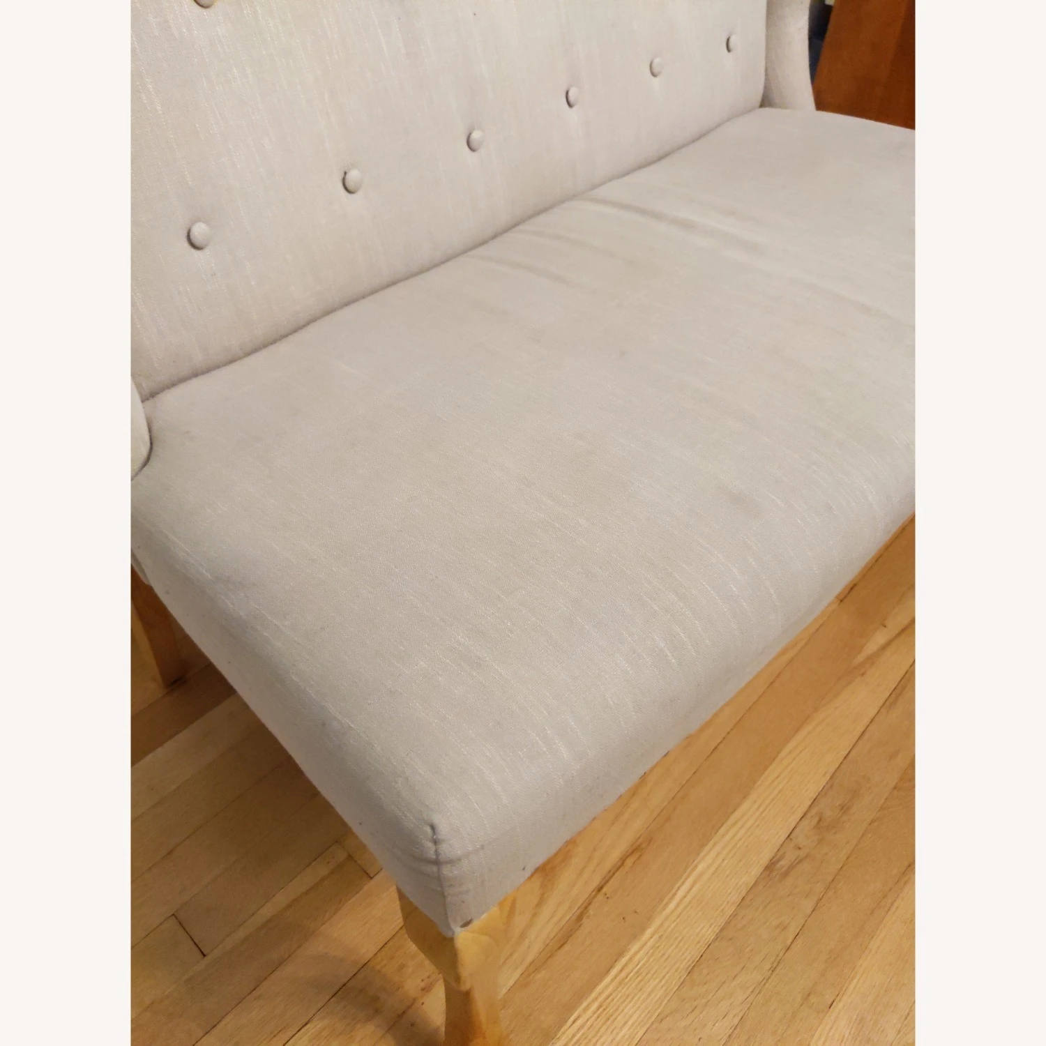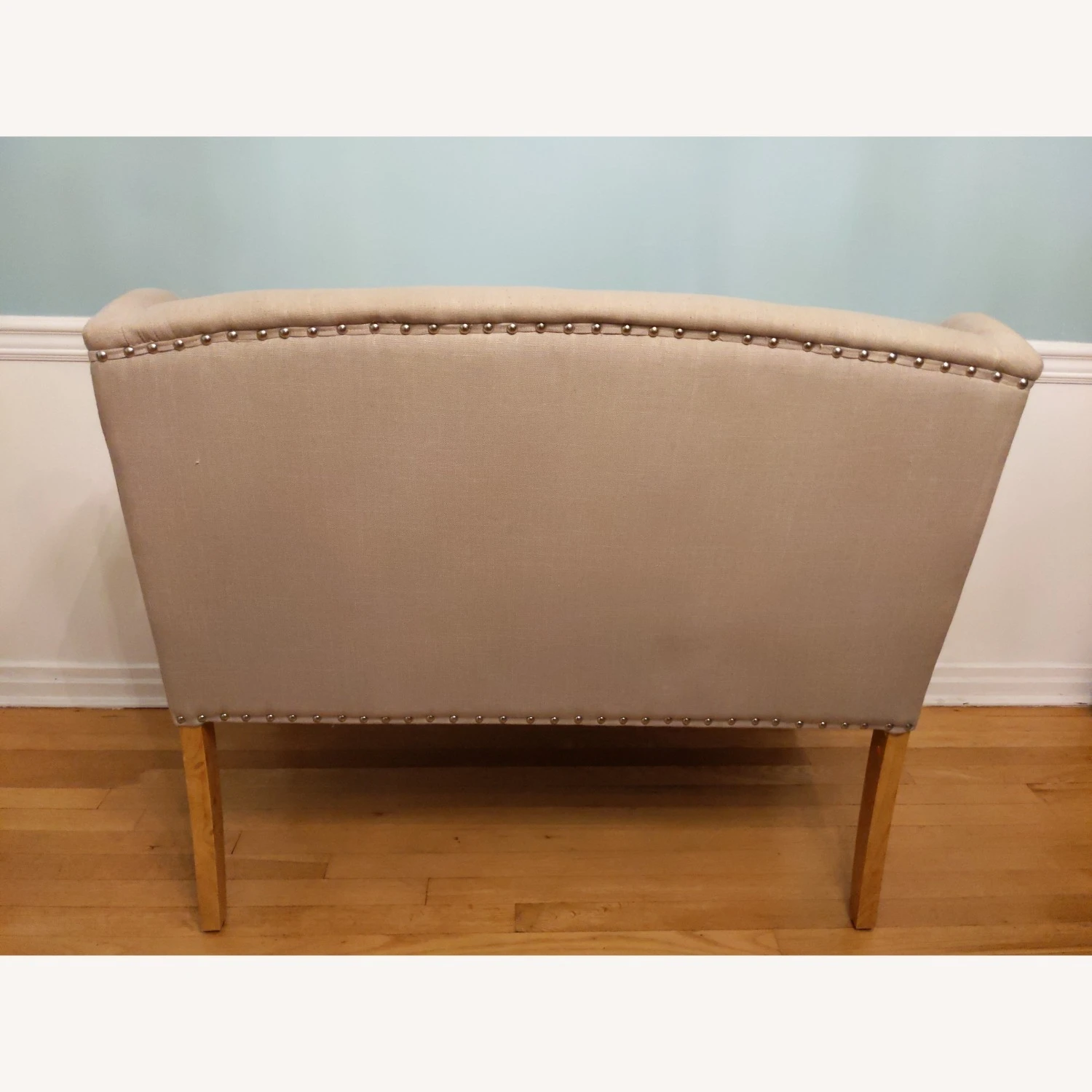 Seller’s Notes: A versatile take on traditional style, this handsome loveseat bench withbwingback silhouette, and nailhead trim gives this piece a touch of classic appeal, while distressed details along this bench’s tapered wood legs lend your space antiqued flair. This foam-filled design is the perfect anchor to your living room/dining room ensemble.